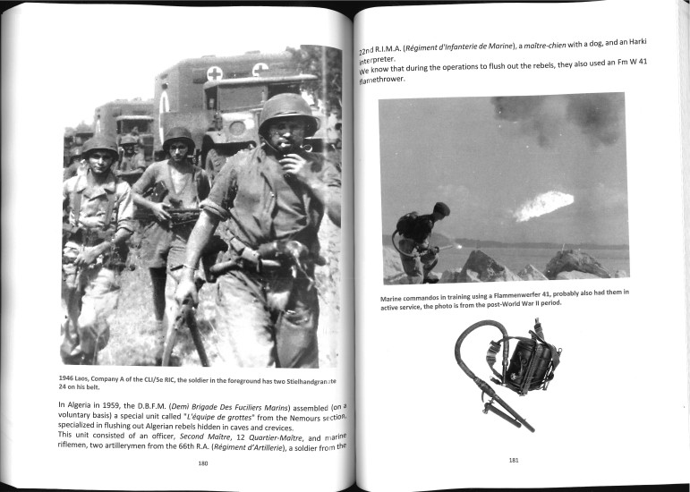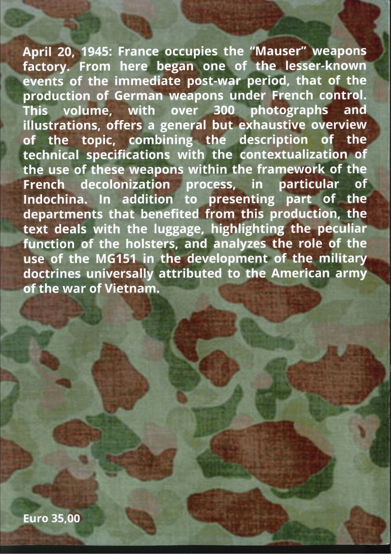 Ce livre édité à compte d'auteur présente pour la première une étude très précise sur les armes allemandes qui ont été capturées et fabriquées au profit de l'armée française à partir de 1945. Nombreuses photos détaillées présentant les spécificités de ces armes, les marquages, ainsi qu'en opérations durant les guerres d'Indochine et d'Algérie.