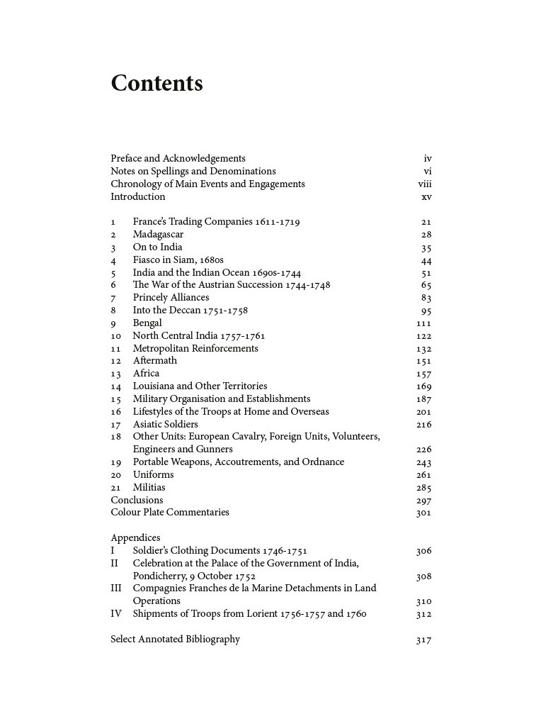 Les sociétés monopolistiques disposaient de troupes très diverses postées dans de nombreux endroits. Le port de Lorient en France était, à partir de la fin du XVIIe siècle, le dépôt et le centre de formation des troupes européennes. Certains servent comme marines sur les navires de la compagnie, d’autres dans une multitude de forts et de pavillons de traite sur trois continents. Leur recrutement et leur commandement sont décrits. En Inde, leur rôle tactique se multiplie et conduit à la création d'unités d'artilleurs, de grenadiers à cheval, de dragons, de hussards et de grenadiers, tous dotés d'uniformes bien distincts. Il y avait des unités de cipayes, de topas et de caffres ainsi que des armées princières alliées auxiliaires en Inde et des soldats auxiliaires entraînés en Afrique. Les quelques soldats de l’armée royale envoyés en Inde à la fin des années 1750 sont également pris en compte. Toutes les troupes des armées indiennes, africaines et métropolitaines sont couvertes et décrites dans cette étude entièrement illustrée.