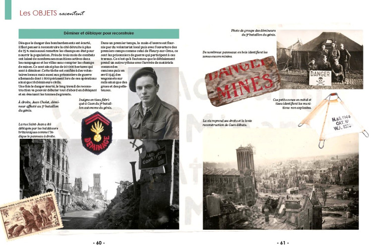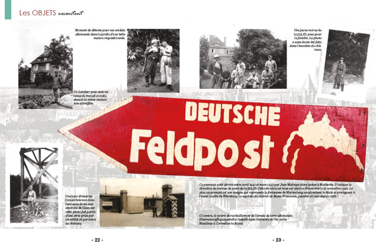 Ce livre a la particularité de présenter des objets et documents en lien avec la ville de Caen en Normandie durant la Seconde Guerre mondiale. C’est ainsi que l’on trouve de nombreuses photos inédites prises par des soldats allemands en garnison au château ou bien par des civils après les bombardements. Vous y verrez aussi de nombreux objets trouvés dans les brocantes et vide-greniers au cours des 40 dernières années comme des reliques de la Première Guerre mondiale des régiments caennais (36e et 43e RA) mais aussi dans des collections privées et présentés pour la première fois.