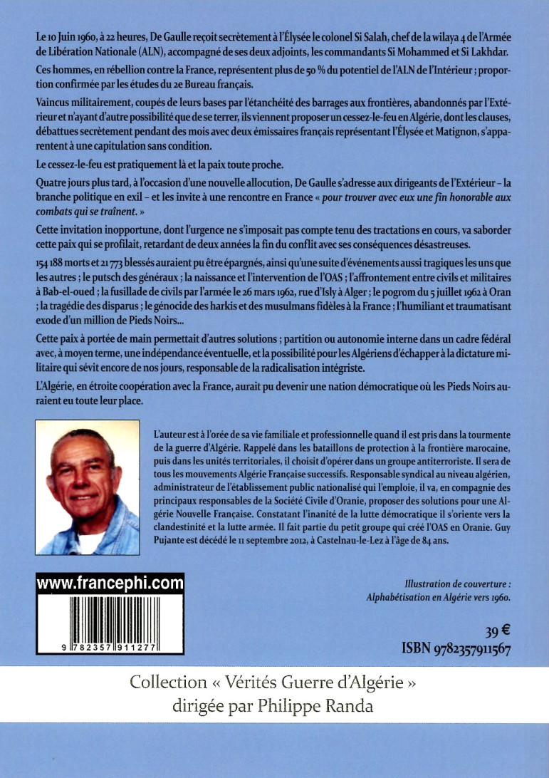Cette paix à portée de main permettait d’autres solutions ; partition ou autonomie interne dans un cadre fédéral avec, à moyen terme, une indépendance éventuelle, et la possibilité pour les Algériens d’échapper à la dictature militaire qui sévit encore de nos jours, responsable de la radicalisation intégriste. L’Algérie, en étroite coopération avec la France, aurait pu devenir une nation démocratique où les Pieds Noirs auraient eu toute leur place.