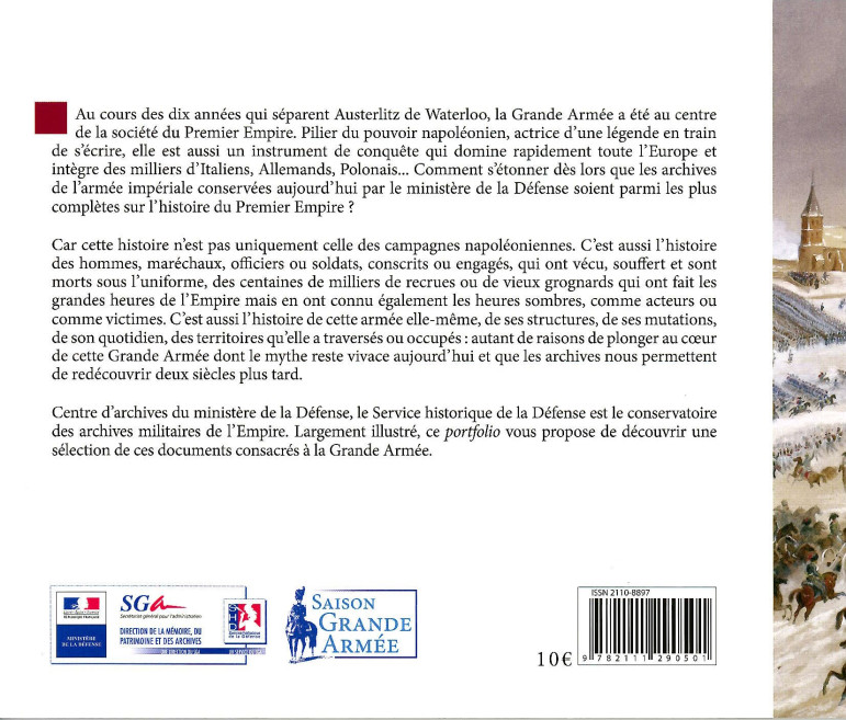 C'est aussi l'histoire des hommes, maréchaux, officiers ou soldats, conscrits ou engagés, qui ont vécu, souffert et sont morts sous l'uniforme, des centaines de milliers de recrues ou de vieux grognards qui ont fait les grandes heures de l'Empire mais en ont connu également les heures sombres, comme acteurs ou comme victimes. C'est aussi l'histoire de cette armée elle-même, de ses structures, de ses mutations, de son quotidien, des territoires qu'elle a traversés ou occupés : autant de raisons de plonger au coeur de cette Grande Armée dont le mythe reste vivace aujourd'hui et que les archives nous permettent de redécouvrir deux siècles plus tard. Centre d'archives du ministère de la Défense, le Service historique de la Défense est le conservatoire des archives militaires de l'Empire.