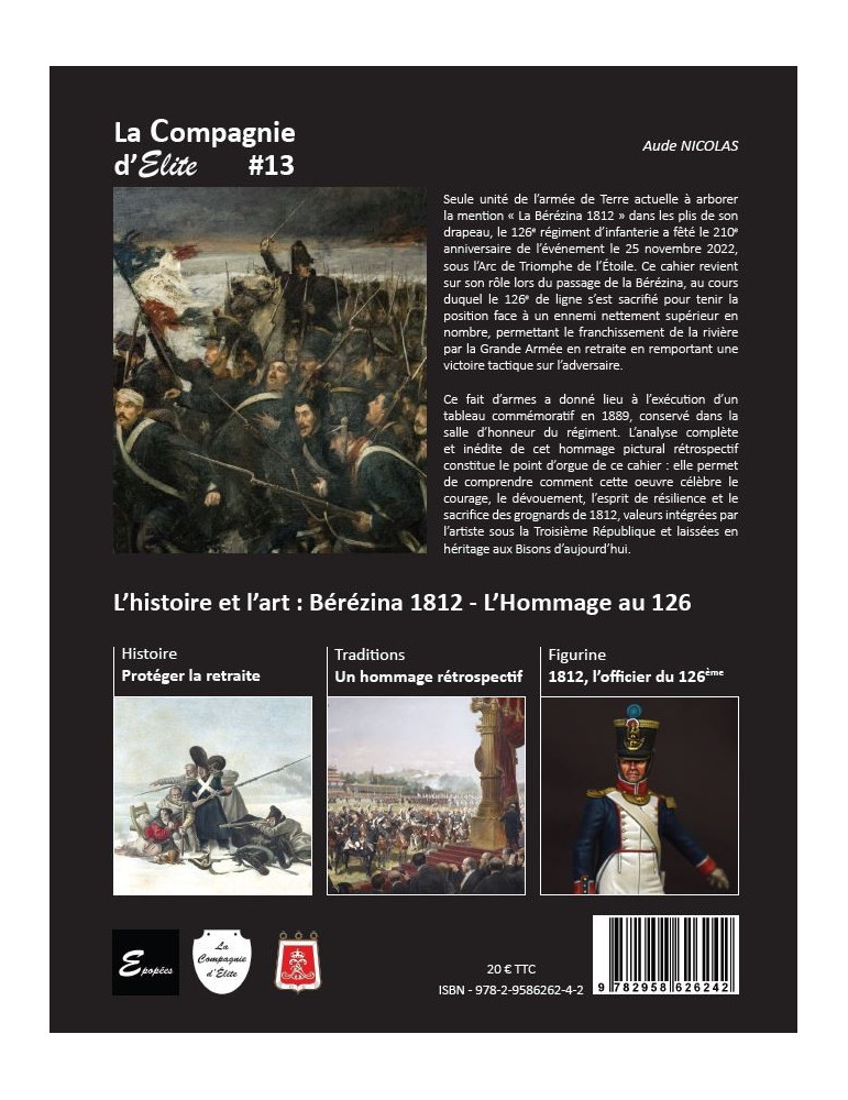 Seule unité de l’armée de Terre actuelle à arborer la mention « La Bérézina 1812 » dans les plis de son drapeau, le 126 e régiment d’infanterie a fêté le 210 e anniversaire de l’événement le 25 novembre 2022, sous l’Arc de Triomphe de l’Étoile. Ce cahier revient sur son rôle lors du passage de la Bérézina, au cours duquel le 126 e de ligne s’est sacrifié pour tenir la position face à un ennemi nettement supérieur en nombre, permettant le franchissement de la rivière par la Grande Armée en retraite en remportant une victoire tactique sur l’adversaire.