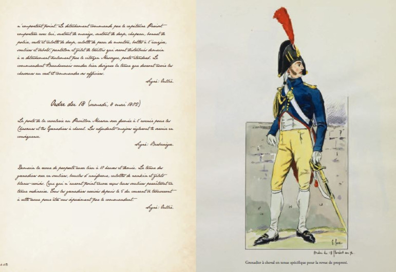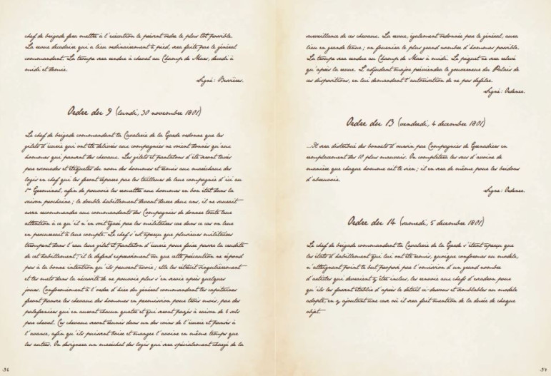 Le général était un très fin bibliophile, il fit d’ailleurs don de la majorité de ses ouvrages au dépôt de la guerre, mais conserva quelques pièces exceptionnelles qu’il eut plaisir à consulter jusqu’à sa disparition. Il aimait à s’entourer de personnes ayant goût pour l’uniforme militaire, et c’est sans retenue qu’il autorisait la consultation et même la copie d’une partie de ses ouvrages. Dans les premières années d’existence des carnets de la sabretache, en 1893 pour être plus précis, le général Vanson, avec l’accord du général Mellinet, publia des extraits de ces carnets sous le titre « la Garde Consulaire ». Il se limitait à 4 pages de texte ; en 1895, 6 autres pages furent publiées et à cette occasion, le maître Edouard Detaille offrit deux dessins aquarellés au membre de l’association ; ces œuvres illustraient cet extrait en s’inspirant des fameux ordres. Mais la partie la plus importante restait inconnue du grand public ! Lors du décès du général Mellinet, les registres furent acquis par un autre collectionneur privé. Ce dernier, ami du lieutenant-colonel Titeux, l’autorisa à recopier tous les extraits lui paressant dignes d’intérêt. Et c’est au cours du mois de janvier 1899, que Titeux retranscrit suivant ses propres mots : « la totalité des ordres intéressant l’organisation et les uniformes de la cavalerie de la Garde Consulaire ». Il précise qu’il n’a pas donné l’arrêté des Consuls du 21 Fructidor An VIII et celui du 9 Vendémiaire An XI présents au début du 1er cahier et à la fin du 7e. Nous pouvons donc raisonnablement penser que cette copie fut très complète. En 1910, le peintre Ernest Fort reprenait et illustrait ce texte à l’aide de 26 aquarelles présentant et illustrant les divers ordres vestimentaires indiqués dans les carnets, ce qui permis de visualiser rapidement la mise en pratique des ordres.