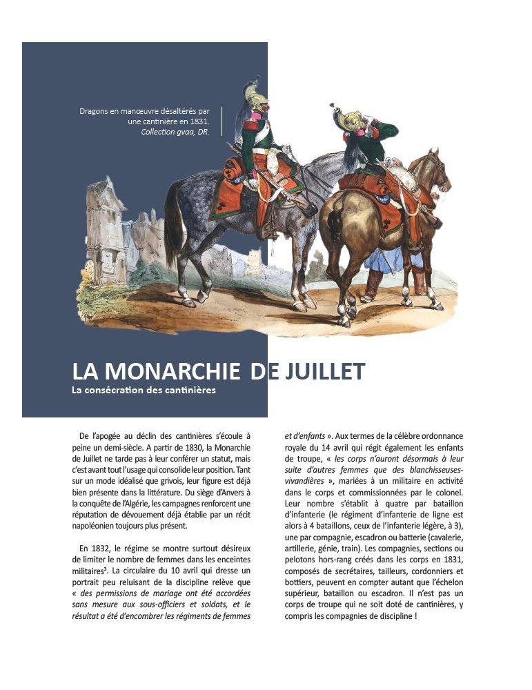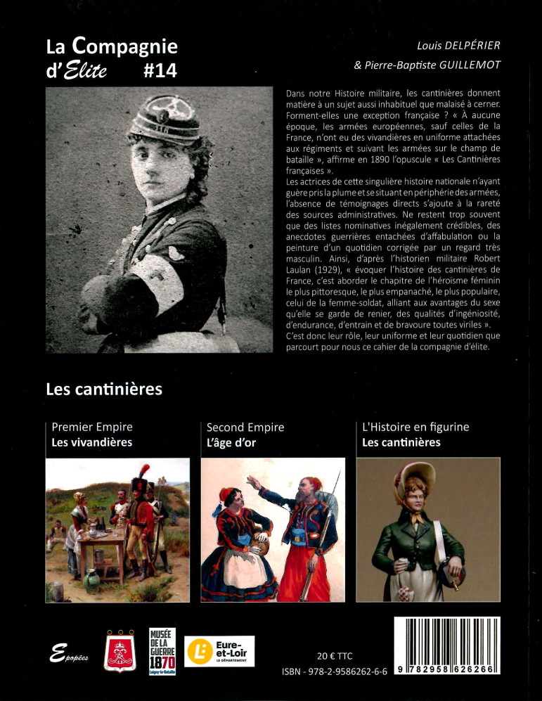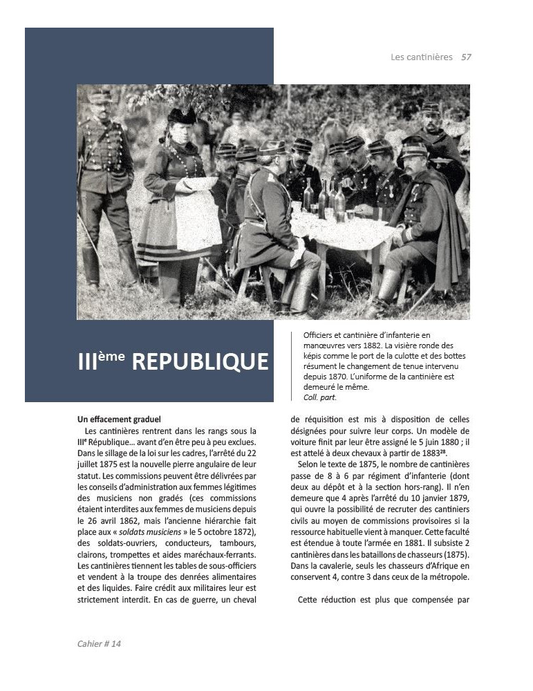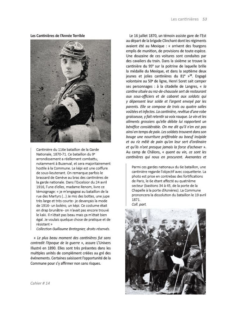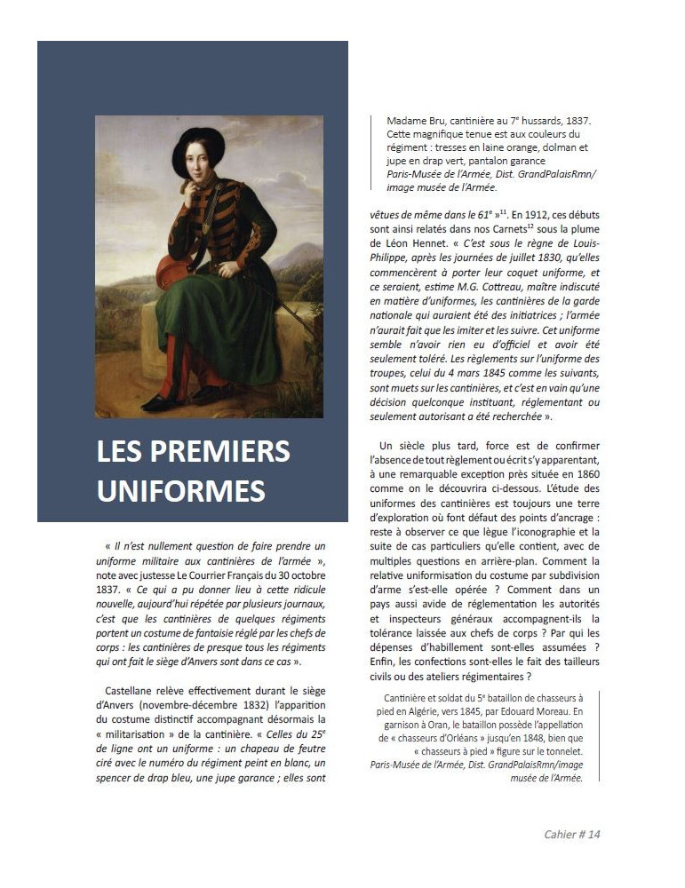 C’est donc leur rôle, leur uniforme et leur quotidien que parcourt pour nous ce cahier de la compagnie d’élite. Pierre-Baptiste Guillemot nous évoquera les vivandières de la Révolution et du Premier Empire puis Louis Delpérier retracera leur parcours de la Monarchie de Juillet à la IIIème République en insistant sur l'âge d'or du Premier Empire.