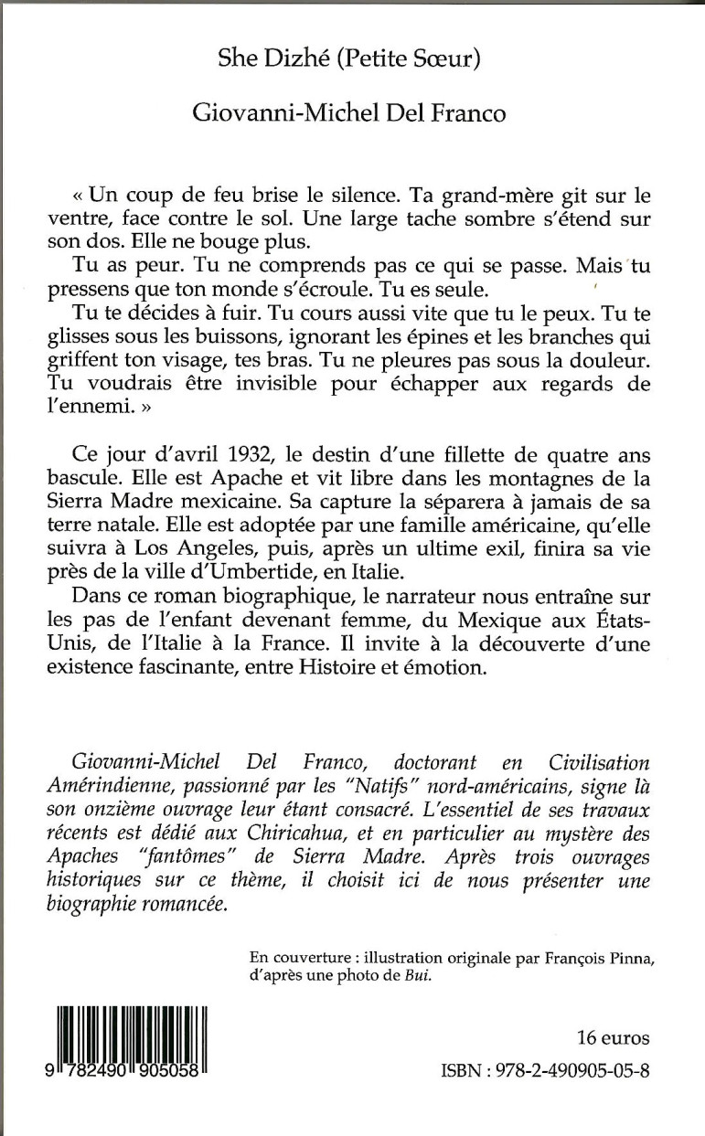 Ce jour d’avril 1932, le destin d’une fillette de quatre ans bascule. Elle est Apache et vit libre dans les montagnes de la Sierra Madre mexicaine. Sa capture la séparera à jamais de sa terre natale. Elle est adoptée par une famille américaine, qu’elle suivra à Los Angeles, puis, après un ultime exil, finira sa vie près de la ville d’Umbertide, en Italie.