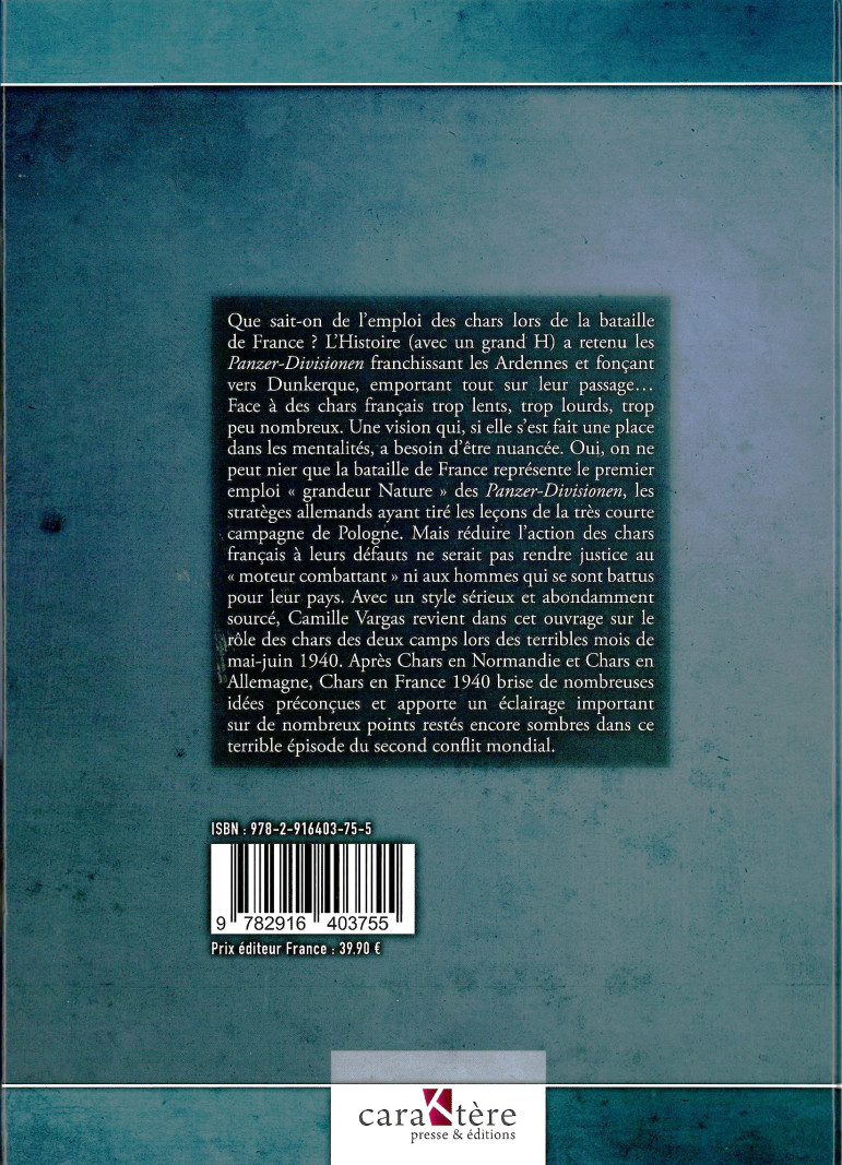 Avec un style sérieux et abondamment sourcé, Camille Vargas revient dans cet ouvrage sur le rôle des chars des deux camps lors des terribles mois de mai-juin 1940. Après Chars en Normandie et Chars en Allemagne, Chars en France 1940 brise de nombreuses idées préconçues et apporte un éclairage important sur de nombreux points restés encore sombres dans ce terrible épisode du second conflit mondial.