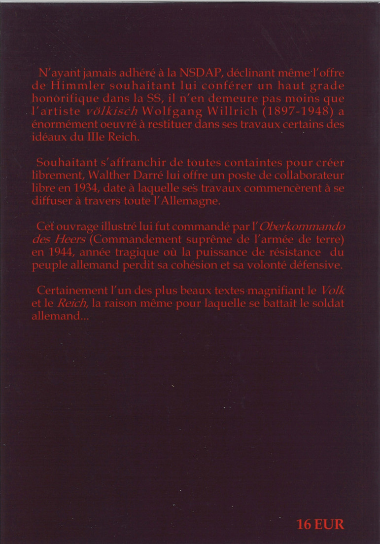 N’ayant jamais adhéré au NSDAP, déclinant même l’offre de Himmler souhaitant lui conférer un haut grade honorifique dans la SS, il n’en demeure pas moins que l’artiste völkisch Wolfgang Willrich (1897-1948) a énormément œuvré à restituer dans ses travaux certains des idéaux du IIIe Reich. Souhaitant s’affranchir de toutes contraintes pour créer librement, Walther Darré lui offre un poste de collaborateur libre en 1934, date à laquelle ses travaux commencèrent à se diffuser à travers toute l’Allemagne.
