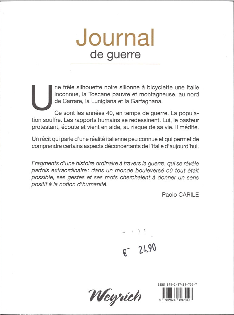 Une frêle silhouette noire sillonne à bicyclette une Italie inconnue, la Toscane pauvre et montagneuse, au nord de Carrare, la Lunigiana et la Garfagnana. Ce sont les années 40, en temps de guerre. La population souffre. Les rapports humains se redessinent. Lui, le pasteur protestant, écoute et vient en aide, au risque de sa vie. Il médite.