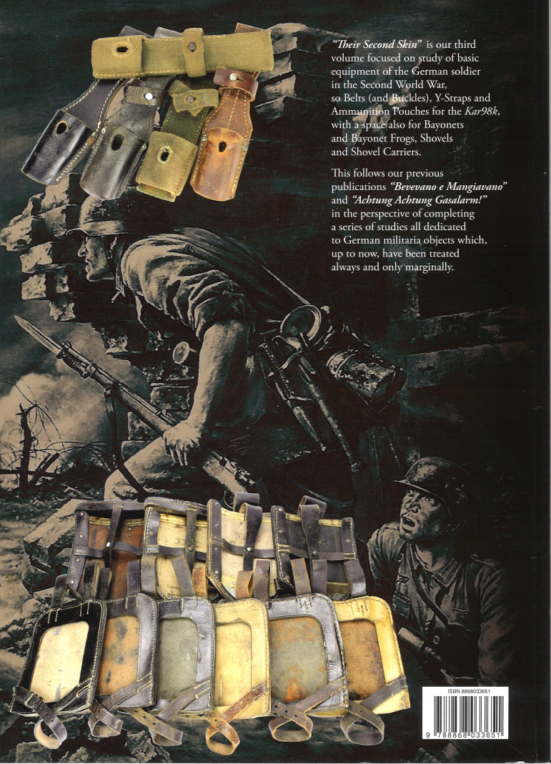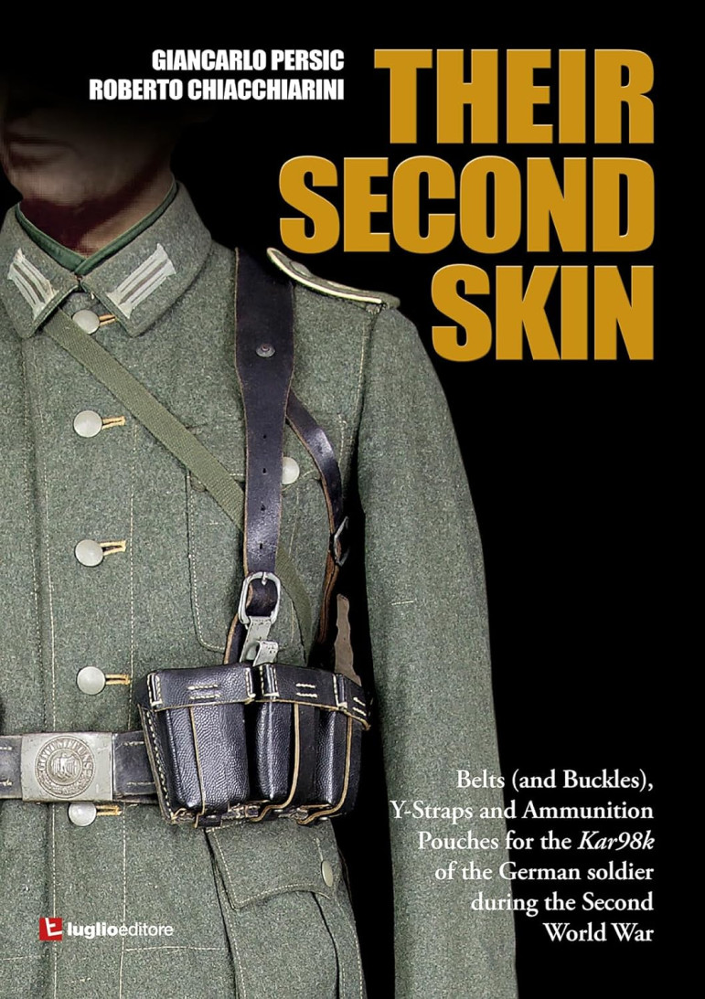 "Leur seconde peau" est le troisième volume de Giancarlo Persic, axé sur l'étude de l'équipement de base du soldat allemand pendant la Seconde Guerre mondiale : ceinturons et boucles, bretelles de suspension en Y, cartouchières pour Kar98k, porte-pelles droites et pliantes et pour finir les goussets de baionnettes K98K.