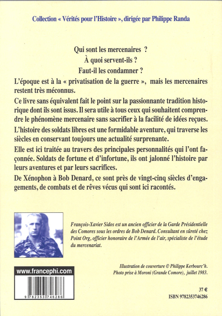 Il sera utile à tous ceux qui souhaitent comprendre le phénomène mercenaire sans sacrifier à la facilité de idées reçues. L’histoire des soldats libres est une formidable aventure, qui traverse les siècles en conservant toujours une actualité surprenante. Elle est ici traitée au travers des principales personnalités qui l’ont façonnée. Soldats de fortune et d’infortune, ils ont jalonné l’histoire par leurs aventures et par leurs sacrifices. De Xénophon à Bob Denard, ce sont près de vingt-cinq siècles d’engagements, de combats et de rêves vécus qui sont ici racontés.