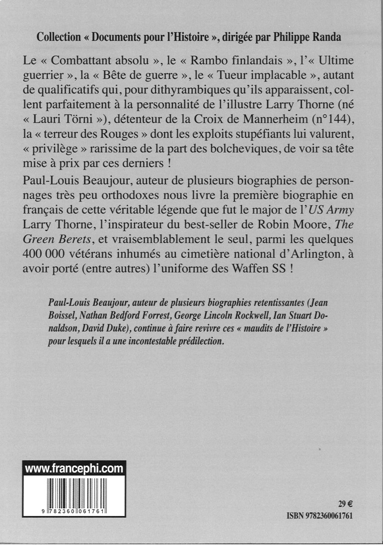 Paul-Louis Beaujour, auteur de plusieurs biographies de personnages très peu orthodoxes nous livre la première biographie en français de cette véritable légende que fut le major de l’US Army Larry Thorne, l’inspirateur du best-seller de Robin Moore, The Green Berets, et vraisemblablement le seul, parmi les quelques 400 000 vétérans inhumés au cimetière national d’Arlington, à avoir porté (entre autres) l’uniforme des Waffen SS !