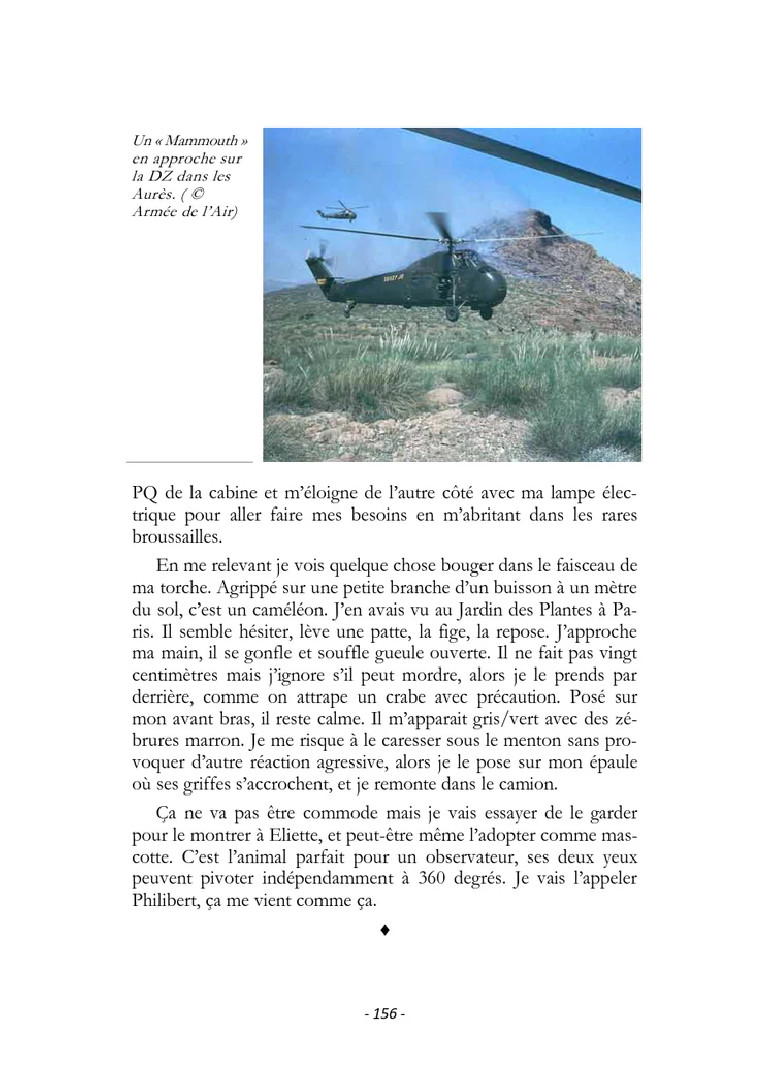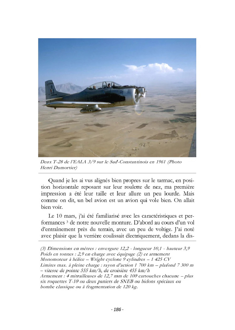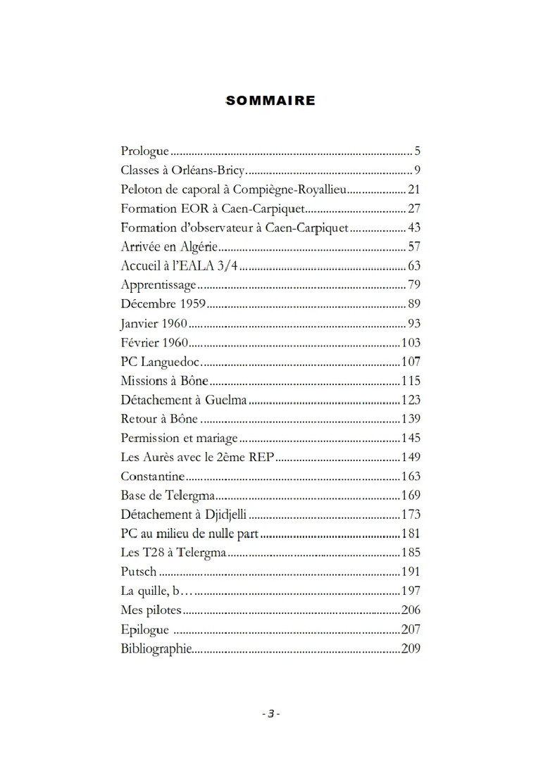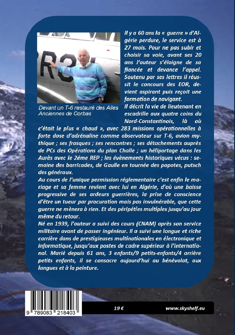 Il décrit la vie de lieutenant en escadrille aux quatre coins du Nord-Constantinois, là où c’était le plus « chaud », avec 283 missions opérationnelles à forte dose d’adrénaline comme observateur sur T-6, avion mythique ; ses frasques ; ses rencontres ; ses détachements auprès de PCs des Opérations du plan Challe ; un héliportage dans les Aurès avec le 2éme REP ; les évènements historiques vécus : semaine des barricades, de Gaulle en tournée des popotes, putsch des généraux.
