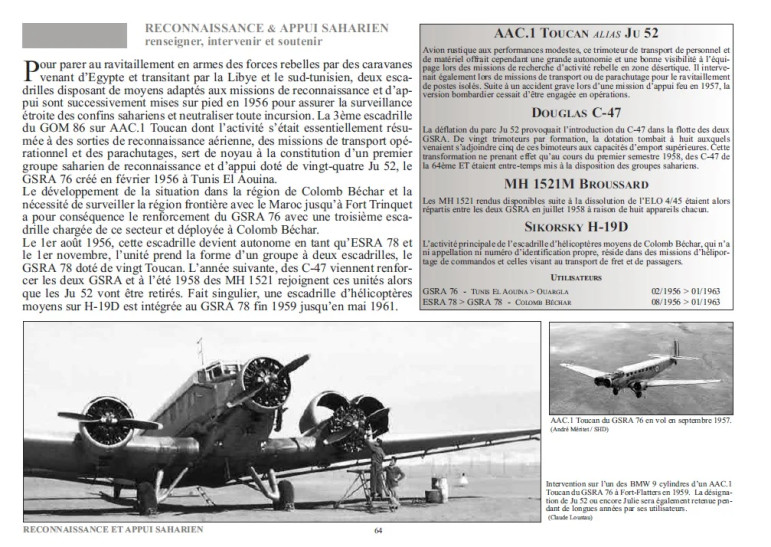 Moyens aériens engagés par l’armée de l’Air lors des opérations de pacification en 5ème Région Aérienne. Ce livre fait l’inventaire des principaux aéronefs de l’armée de l’Air Française (avions et hélicoptères) engagés sur l’ensemble de la 5ème RA (Maroc, Algérie, Tunisie) entre mai 1945 et mars 1962 dans ce qu’il était alors convenu d’appeler les opérations de maintien de l’ordre.