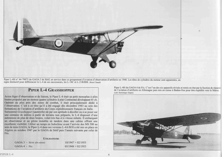 Les avions de type Piper L-4, dits Piper Cub, sont réceptionnés en Algérie en septembre et octobre 1943 et c’est en plein hiver 43/44 que les équipages effectuent leurs premières missions au-dessus du théâtre d’opération italien, montagneux et fort peu propice aux évolutions des jeunes pilotes qui doivent également se méfier d’une Flak abondante.