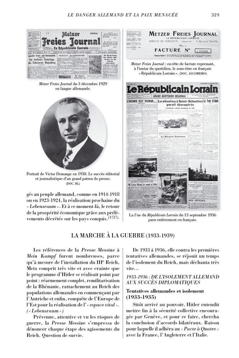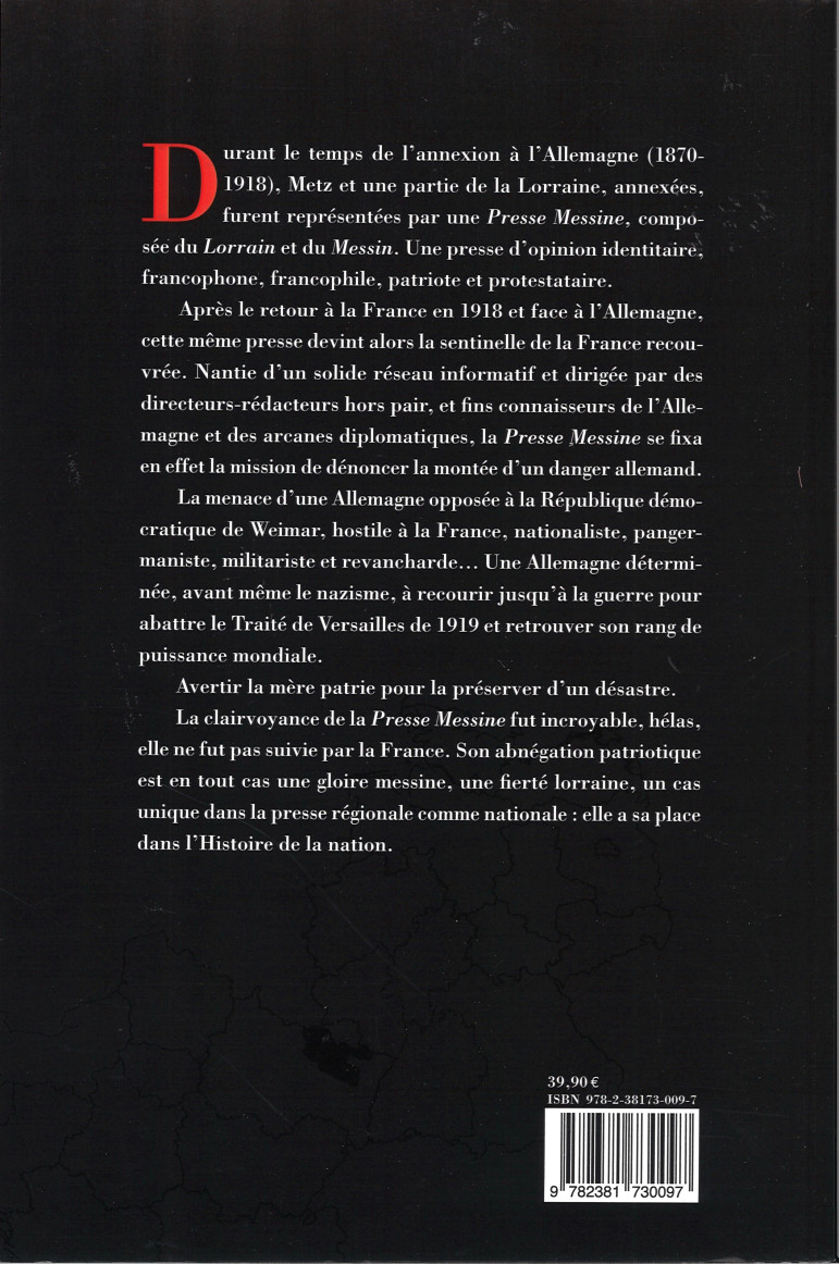 Avertir la mère patrie pour la préserver d’un désastre. La clairvoyance de la Presse Messine fut incroyable, hélas, elle ne fut pas suivie par la France. Son abnégation patriotique est en tout cas une gloire messine, une fierté lorraine, un cas unique dans la presse régionale comme nationale : elle a sa place dans l’Histoire de la nation. 280 illustrations et photos.