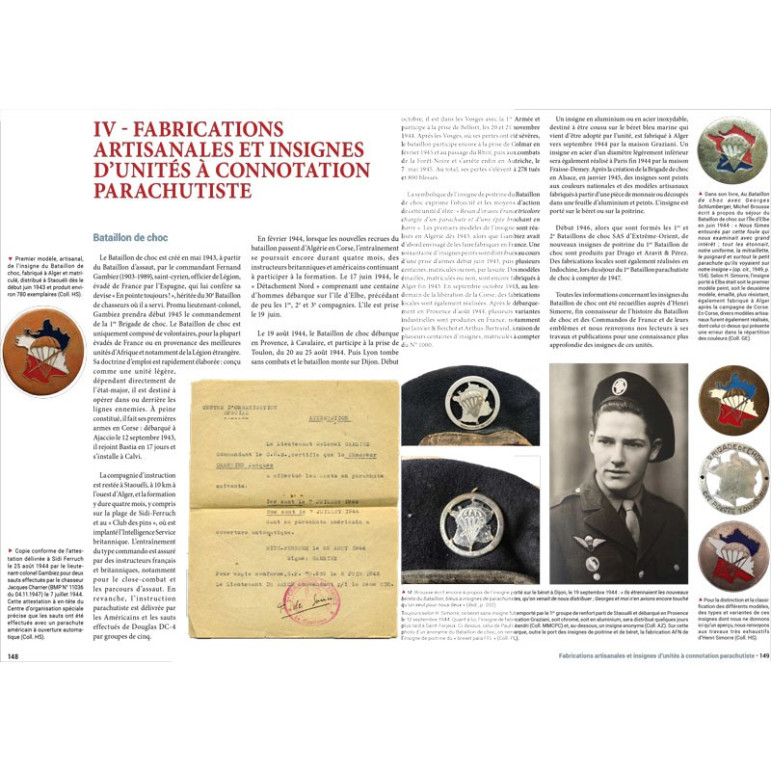 Cet ouvrage exceptionnel, indispensable aux collectionneurs et aux chercheurs concernés par la saga des parachutistes français, présente nombre d'ensembles nominatifs comprenant insigne, diplôme ou certificat de brevet qui aident à authentifier, dater et localiser la fabrication de certaines pièces.