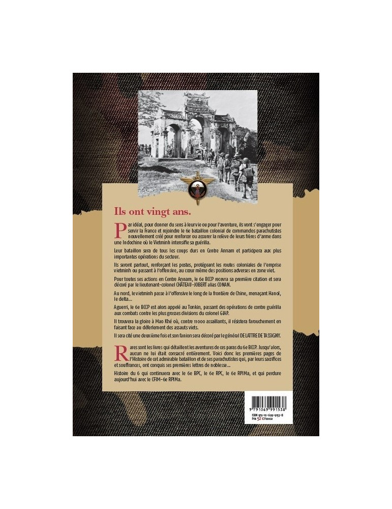 Rares sont les livres qui détaillent les aventures de ces paras du 6e BCCP. Jusqu'alors, aucun ne lui était consacré entièrement. Voici donc les premières pages de l'Histoire de cet admirable bataillon et de ses parachutistes qui, par leurs sacrifices et souffrances, ont conquis ses premières lettres de noblesse...