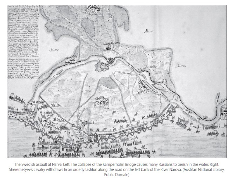 Après avoir envahi avec succès le Danemark et forcé le roi Frédéric II de Danemark et la Norvège à se retirer de la guerre, le roi Charles II tourna son attention vers le front oriental et la Russie. Après une longue et pénible marche, l'armée suédoise arriva aux abords de Narva à la fin du mois de novembre 1700. Le roi de Suède ordonna à ses hommes d'attaquer immédiatement les lignes de défense fortifiées russes. Avec l'aide d'un blizzard et le vent dans le dos, les Suédois attaquèrent et percèrent les défenses russes. Pris de panique, les Russes s'enfuirent et finirent par se rendre au roi Charles. Ce fut une défaite écrasante. Le tsar Pierre II perdit toute son armée, y compris la plupart des commandants supérieurs qui tombèrent également en captivité. La bataille eut pour effet immédiat l'évacuation de toute l'Ingrie par les Russes.