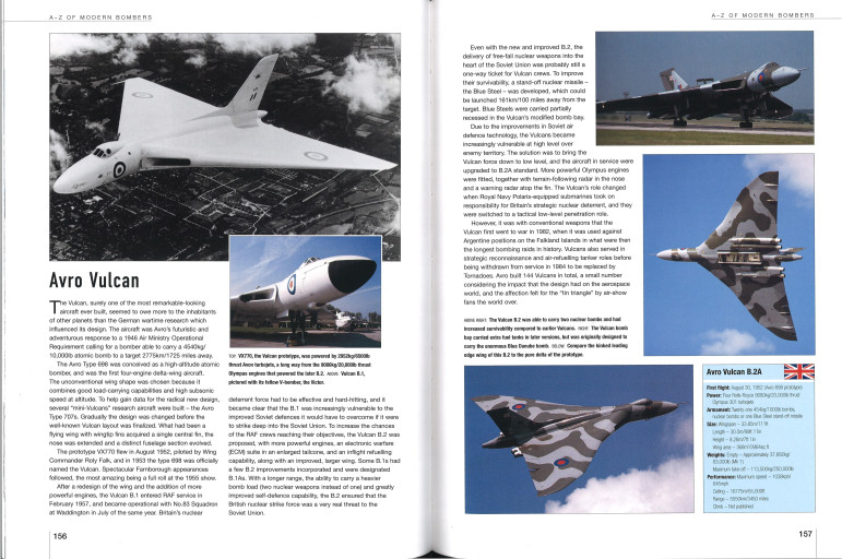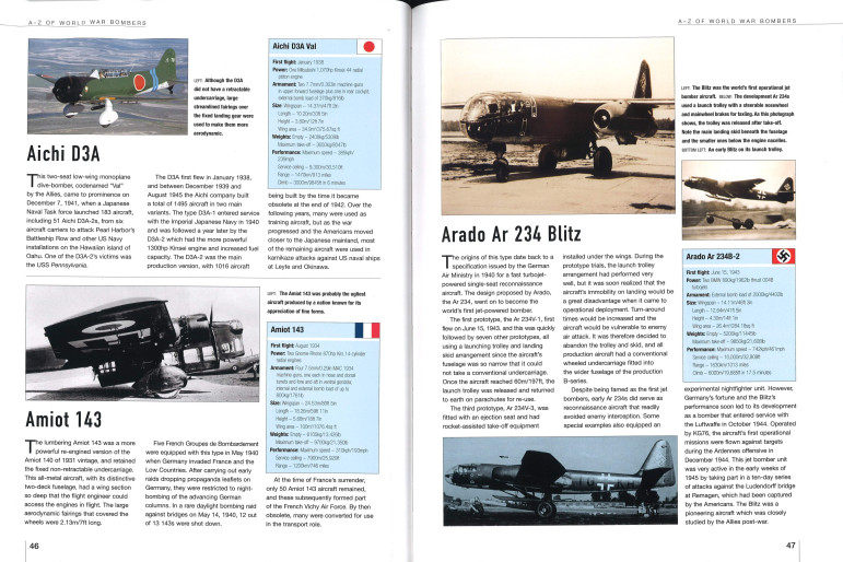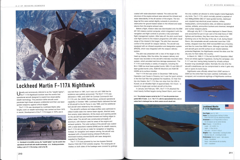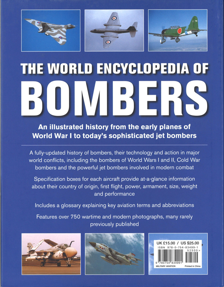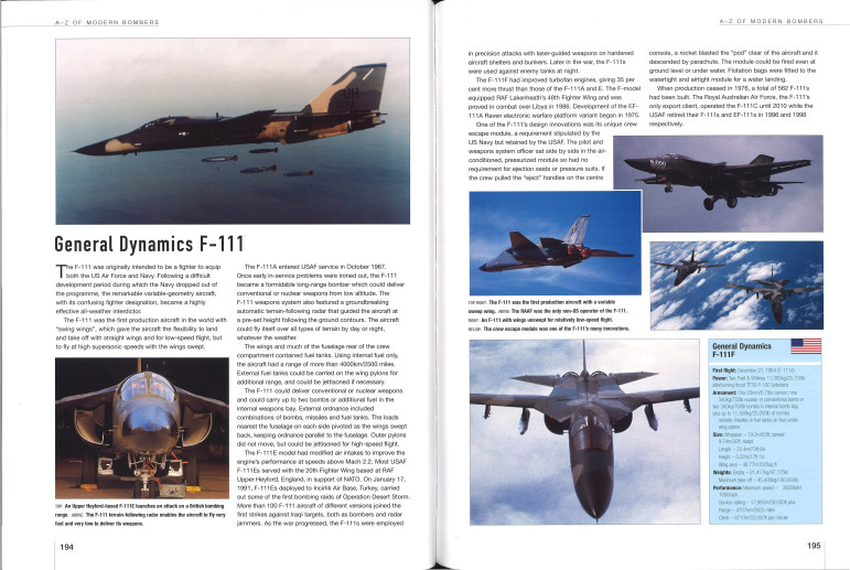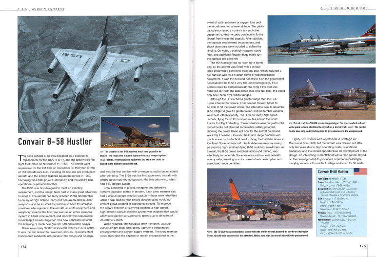 Le recours à la « furtivité » dans la technologie des bombardiers a également constitué un développement particulièrement important pendant la guerre froide. Chaque avion du livre est classé par ordre alphabétique par constructeur et est accompagné d'un encadré de spécifications contenant des informations sur le pays d'origine, le premier vol, les puissances, les armements, la taille, le poids et les performances.