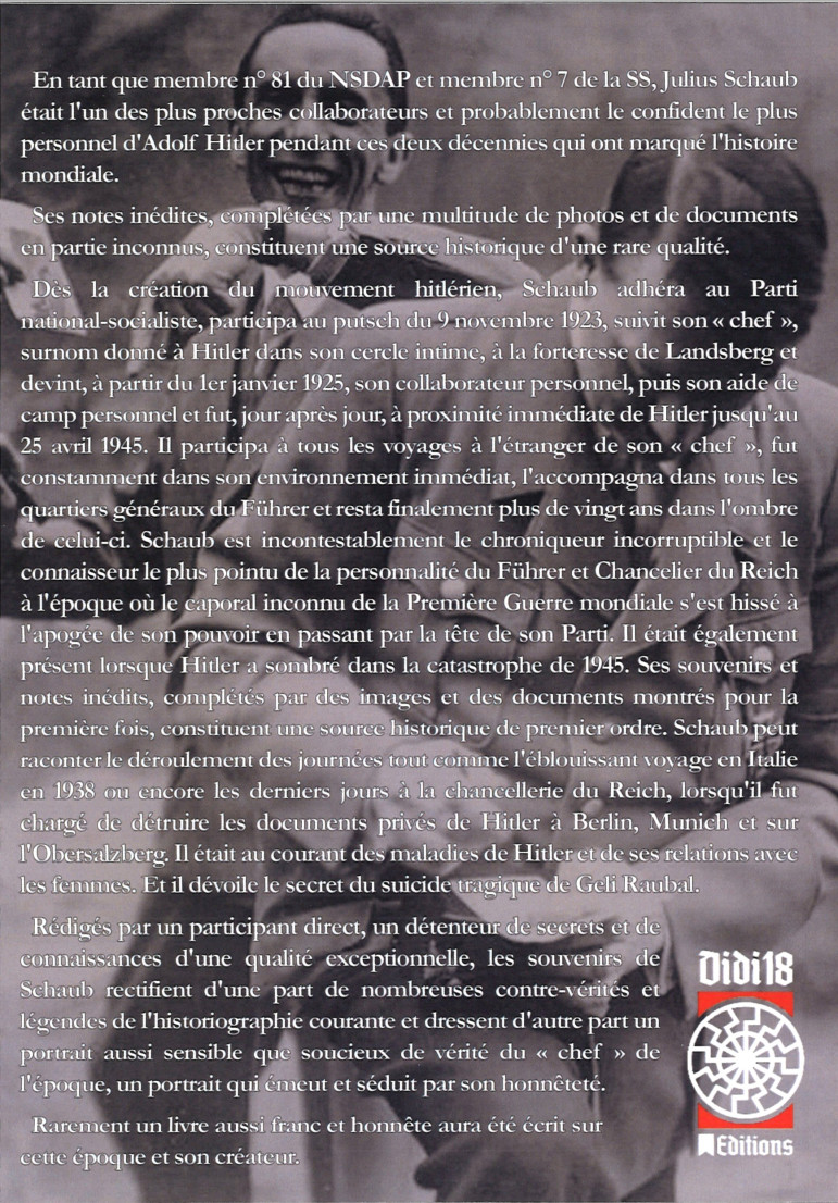 Schaub est incontestablement le chroniqueur incorruptible et le connaisseur le plus pointu de la personnalité du Führer et Chancelier du Reich à l'époque où le caporal inconnu de la Première Guerre mondiale s'est hissé à l'apogée de son pouvoir en passant par la tête de son Parti. Il était également présent lorsque Hitler sombré dans la catastrophe de 1945. Ses souvenirs et notes inédits, complétés par des images et des documents montrés pour la première fois, constituent une source historique de premier ordre. Schaub peut raconter le déroulement des journées tout comme l'éblouissant voyage en Italie en 1938 ou encore les derniers jours à la chancellerie du Reich, lorsqu'il fut chargé de détruire les documents privés de Hitler à Berlin, Munich et sur l'Obersalzberg. Il était au courant des maladies de Hitler et de ses relations avec les femmes. Et il dévoile le secret du suicide tragique de Geli Raubal.