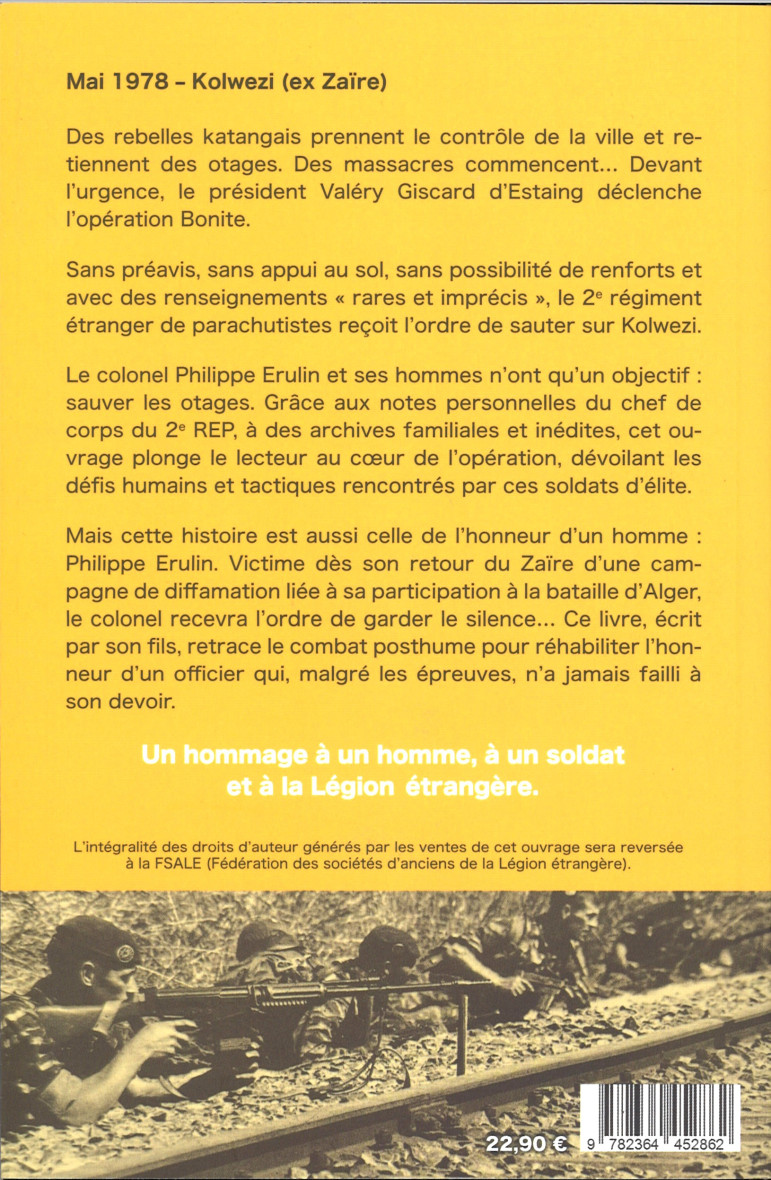 Grâce aux notes personnelles du chef de corps du 2e REP, à des archives familiales et documents inédits, cet ouvrage plonge le lecteur au cœur de l’opération, dévoilant les défis humains et tactiques rencontrés par ces soldats d'élite. Mais cette histoire est aussi celle de l’honneur d’un homme : Philippe Erulin. Victime dès son retour du Zaïre d’une campagne de diffamation liée à sa participation à la bataille d’Alger, le colonel recevra l’ordre de garder le silence...