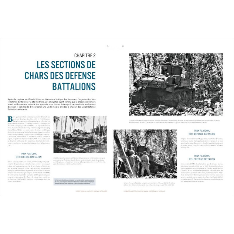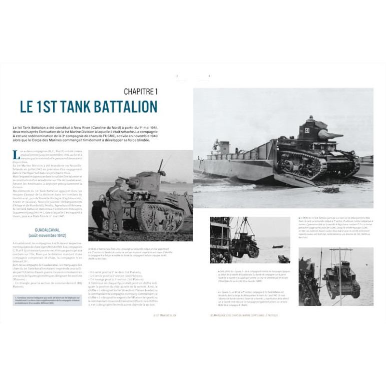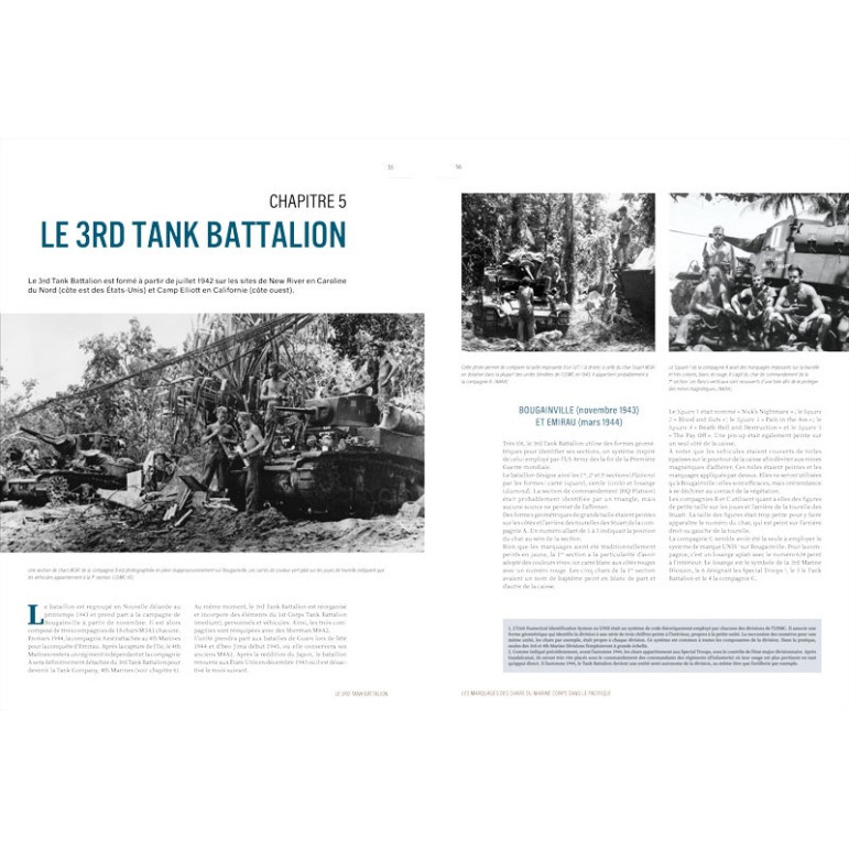 Cette publication détaille et explique pour la première fois les marquages utilisés sur les chars de l’USMC entre 1942 et 1945. Plutôt qu’organiser le livre de façon linéaire (chronologique), chaque chapitre sera consacré à une unité. Ceux-ci seront divisés par bataille où seront détaillées les marques de l’unité jusqu’au niveau de la section. De nombreuses photographies et profils couleurs enrichissent le contenu.