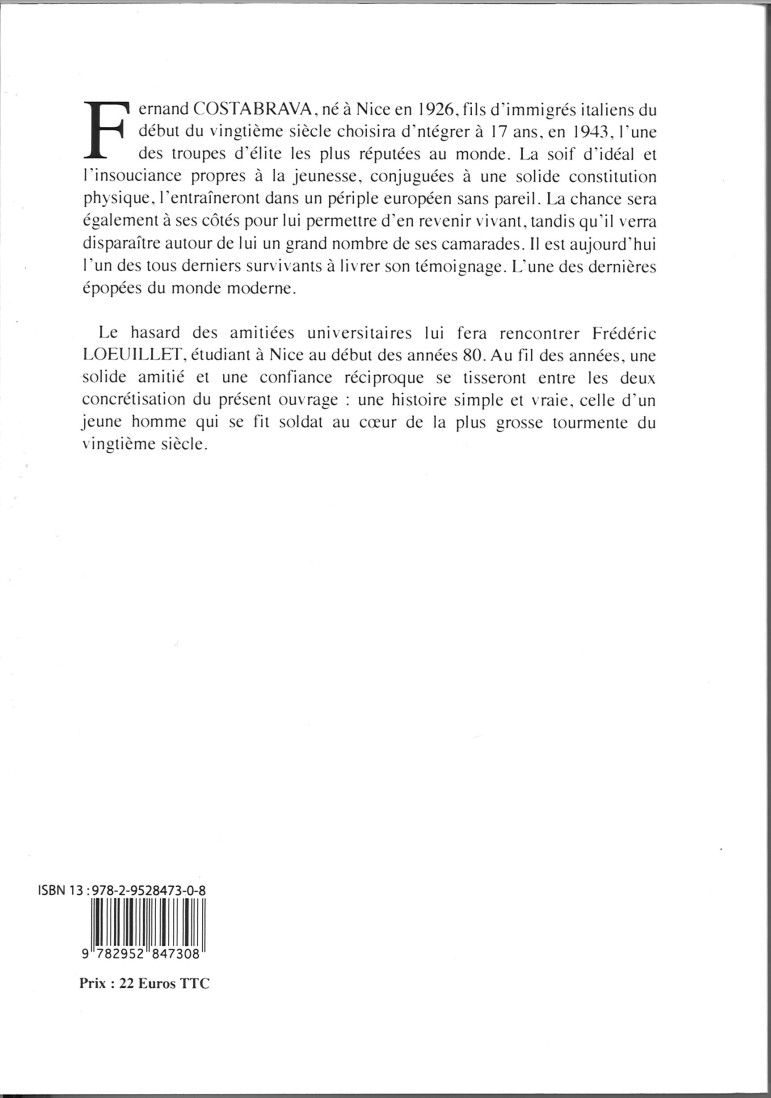 Fernand Costabrava, né à Nice en 1926, fils d'immigrés italiens du début du vingtième siècle choisira d'intégrer à 17 ans, en 1943, l'une des troupes d'élite les plus réputées au monde. La soif d'idéal et l'insouciance propres à la jeunesse, conjuguées à une solide constitution physique, l'entraîneront dans un périple européen sans pareil.