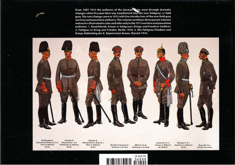 De 1907 à 1915, les uniformes de l'armée allemande ont subi des changements spectaculaires lorsque le bleu de Prusse a été transformé en le nouveau « feldgrau », ou gris champêtre. Le changement suivant survint en 1915 avec l'introduction des nouveaux uniformes gris de guerre et de paix. Ce volume combine trois volumes d'époque et chacun est illustré en couleur et fait référence uniquement aux uniformes de guerre et de paix de 1915 :