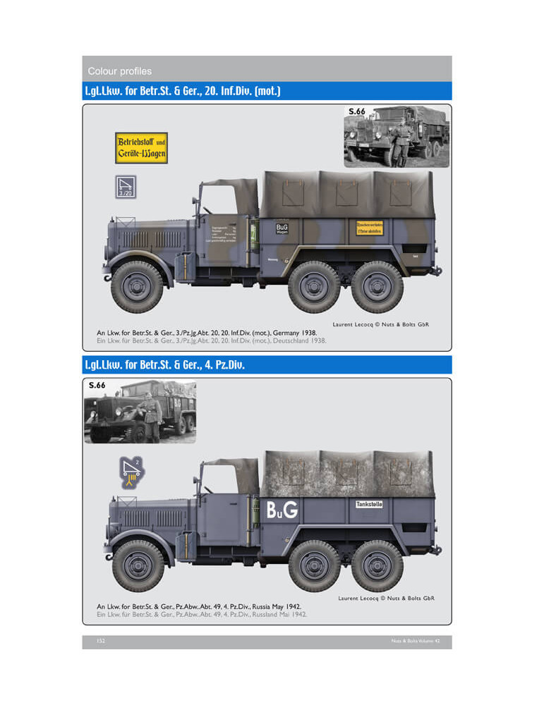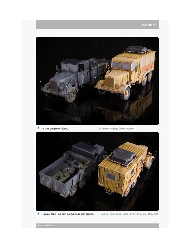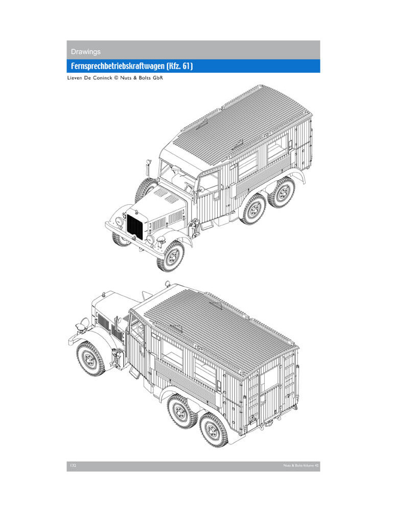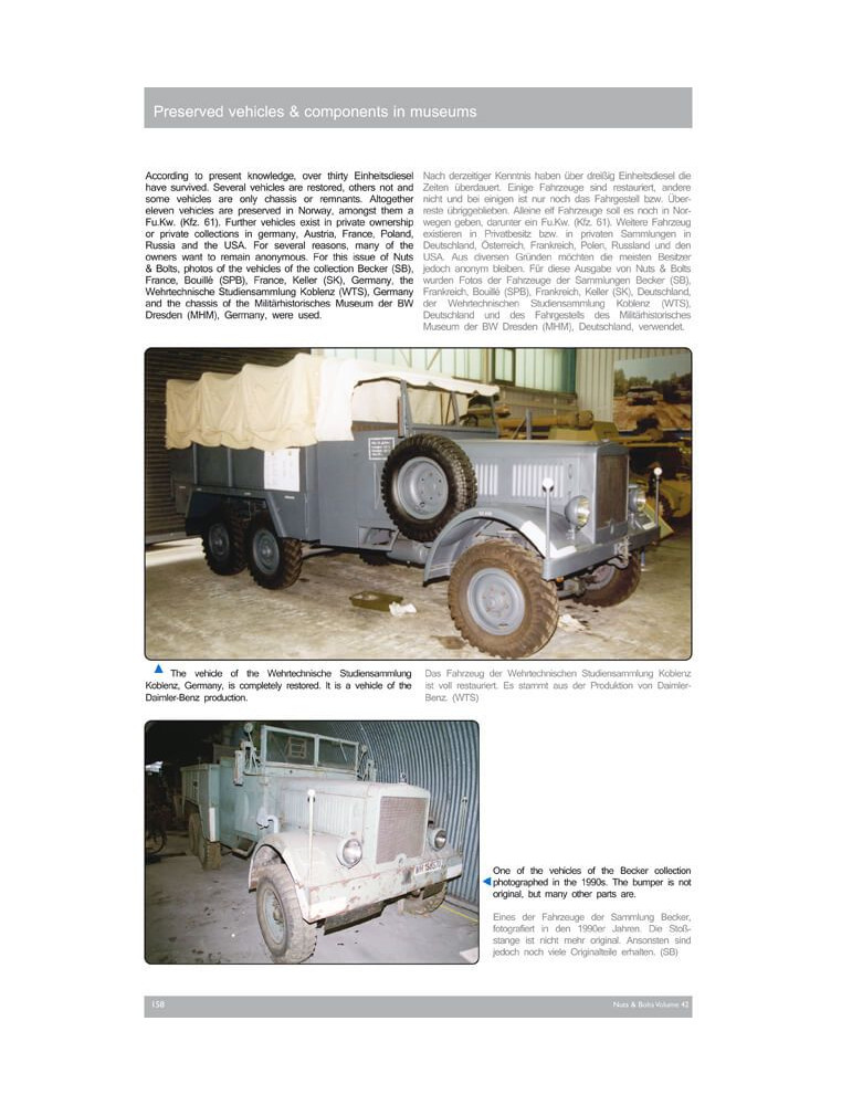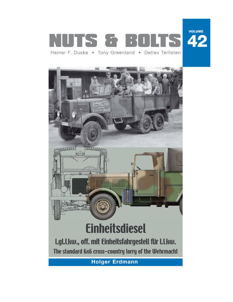 Le livre comprend également 37 photographies en couleur de maquettes réalisées par Tony Greenland, Vinnie Branigan et David Nickels, des légendes en anglais et en allemand, 39 pages de texte bilingue, 6 tableaux, 27 pages de dessins à l'échelle 1:35 de toutes les versions et détails réalisés par Lieven DeConinck, 16 schémas de camouflage de Laurent Lecocq, ainsi que 3 tableaux d'organisation d'unités (Kriegstärke-Nachweisungen KStN) disposant de ces véhicules dans leur arsenal. L'Einheitsdiesel, officiellement désigné comme "leichter geländegängiger Einheits-Lkw 2,5 t" (camion standard léger tout-terrain de 2,5 tonnes), était un camion standardisé développé pour la Wehrmacht avant la Seconde Guerre mondiale. Produit entre 1937 et 1940, il a été utilisé tout au long du conflit.