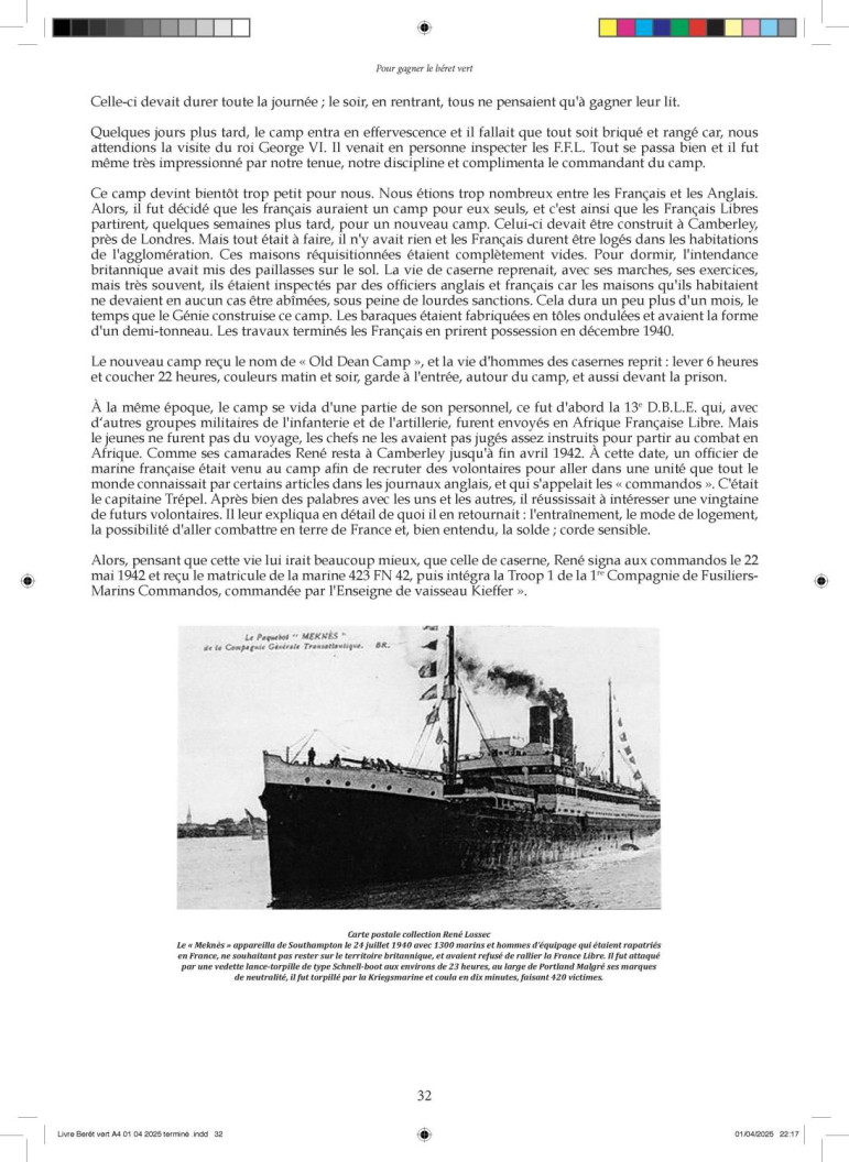 Ce livre relate comment, parfois au prix de leurs vies, de jeunes français refusèrent la défaite et surtout l’odieux armistice du 22 juin 1940. Certains de ces futurs commandos qui subirent l’oppression allemande, puis les brimades et les mensonges de la propagande de Vichy décidèrent de quitter la France parfois en désertant de la Marine Nationale par exemple. Ces hommes, épris de liberté et de patriotisme qui se trouvaient en France choisirent de rallier l’Angleterre ou l’Afrique du Nord en passant par l’Espagne franquiste où ils furent internés plus ou moins longuement au sinistre camp de Miranda de Ebro. Sur l’ensemble de l’armée française, seul un très petit nombre de soldats rallièrent les forces libres, comme ces marins qui désertèrent du cuirassé français Richelieu en refonte aux États-Unis ou ceux de l’escadre des Antilles françaises pourtant commandée d’une main de fer par l’amiral Rober, haut-commissaire, resté fidèle jusqu’au bout à Pétain et à son gouvernement. Dès leur arrivée sur le sol britannique, ils furent emprisonnés pour interrogatoire dans les locaux du Patriotique School à Londres. Cette façon de faire permettait de détecter les éventuels espions de Vichy ou du Reich. Une fois cette épreuve passée, les évadés choisissaient dans quelle arme ils souhaitaient servir. Il était fréquent que les plus jeunes, moins de 18 ans, choisissent la Marine de guerre. Pour d’autres, ce fut les parachutistes et les commandos, pensant qu’au moment du débarquement, ils seraient les premiers libérateurs de la patrie. Ceux qui s’orientèrent sur ces unités d’élites participèrent à l’opération Overlord et débarquèrent le 6 juin 1944 sur la plage de Colleville-sur-Orne, devenu Colleville-Montgomery par décret du 14 juin 1946. Ce sont tous ces témoignages exceptionnels qui ont été réunis dans cet ouvrage de 200 pages comportant des photos, illustrations ainsi que des plans expliquant précisément leurs cheminements vers le combat pour la libération de leur pays. Ces hommes appartenaient pour la plupart, au 1er bataillon de fusiliers marins commando, qui, plus tard, donna naissance à la force maritime des fusiliers marins et commandos.
