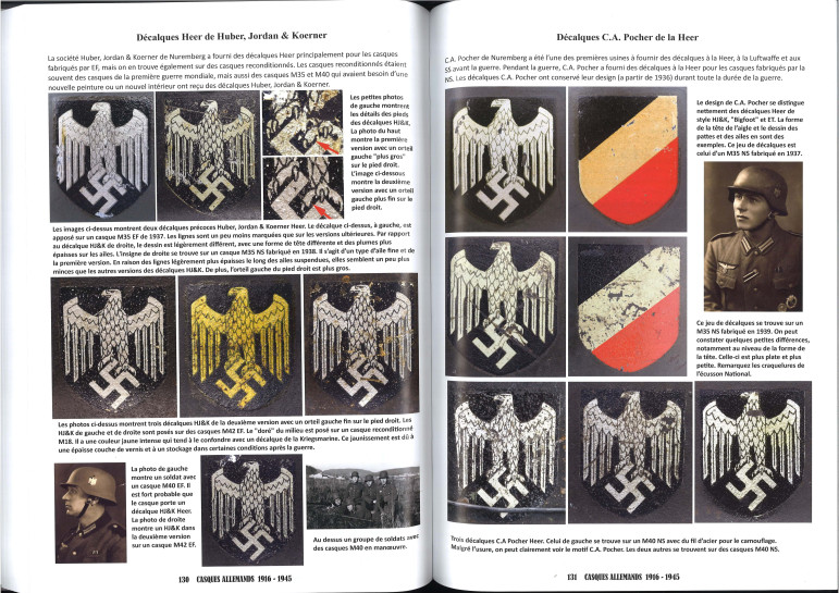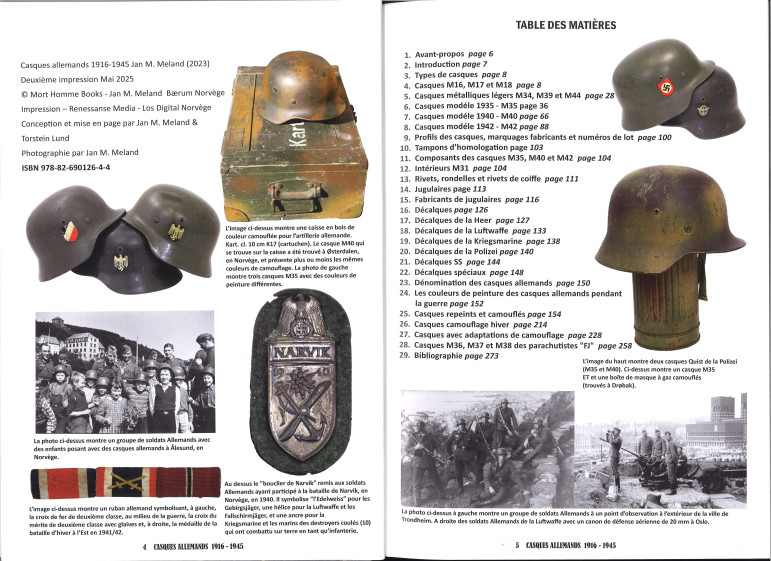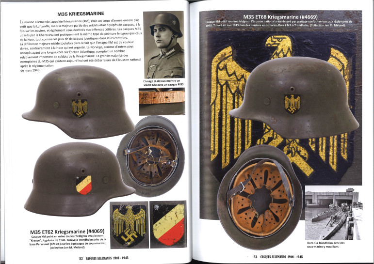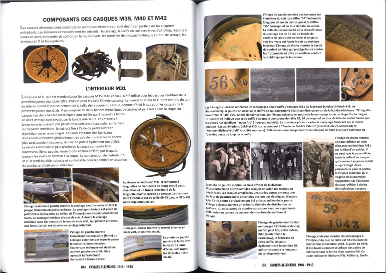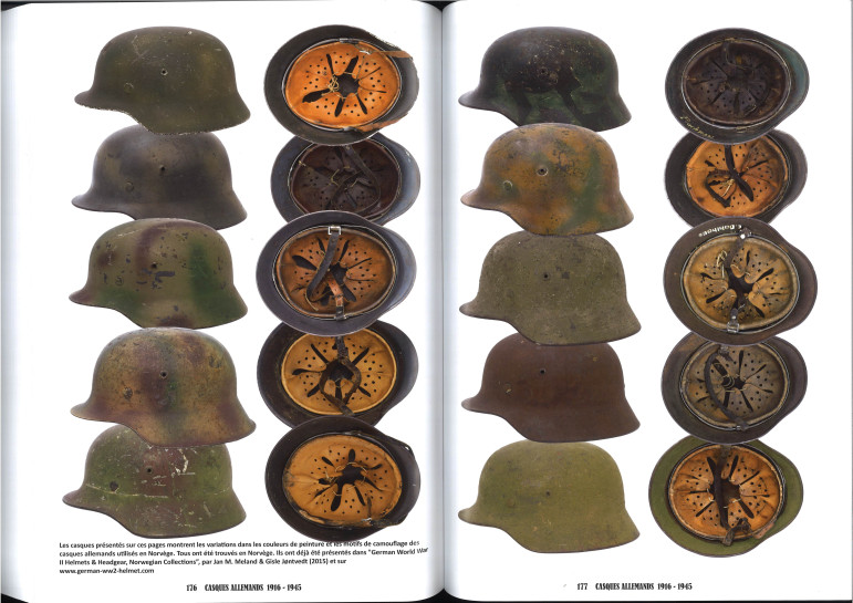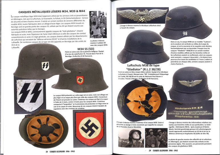 Des photos d'époque de casques en situation sont intégrées. Toutes les variantes de casques avec leurs différentes peintures, insignes, sangles, inscriptions nominatives, tampons ou marques ainsi que les traces de port et d'utilisation sont présentées ici de manière très détaillée.
