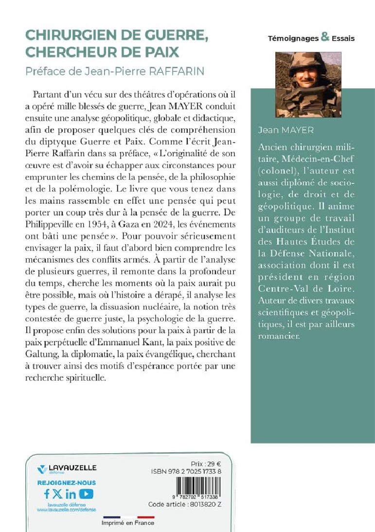 Partant d’un vécu sur des théâtres d’opérations où il a opéré mille blessés de guerre, Jean MAYER conduit ensuite une analyse géopolitique, globale et didactique, afin de proposer quelques clés de compréhension du diptyque Guerre et Paix.
