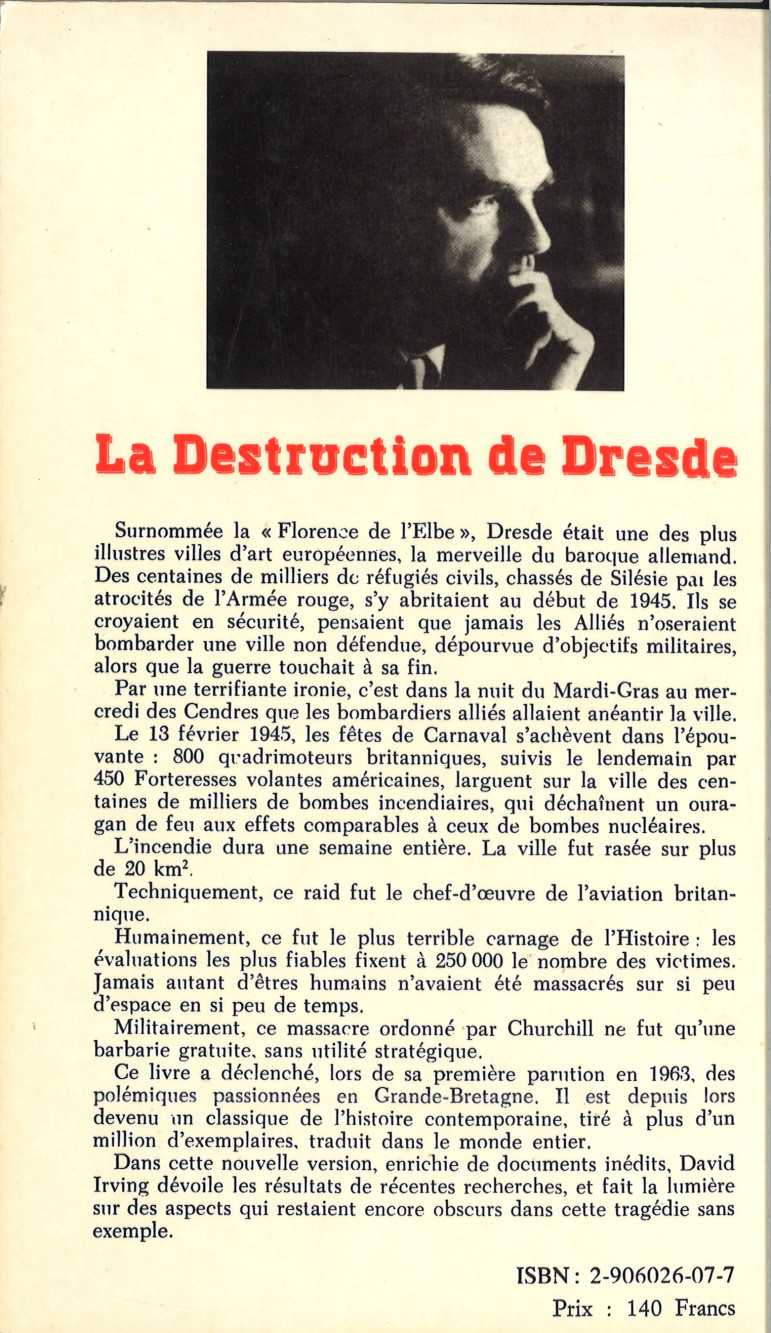 La Destruction de Dresde (édition française 1987) de David Irving retrace, dans un récit saisissant, le bombardement allié de la ville allemande en février 1945. S’appuyant sur témoignages et documents d’époque, l’auteur décrit la nuit où Dresde fut ravagée par les raids aériens anglo-américains, causant un lourd bilan humain. Édition illustrée, au ton narratif fort, destinée aux passionnés d’histoire militaire et de la Seconde Guerre mondiale.