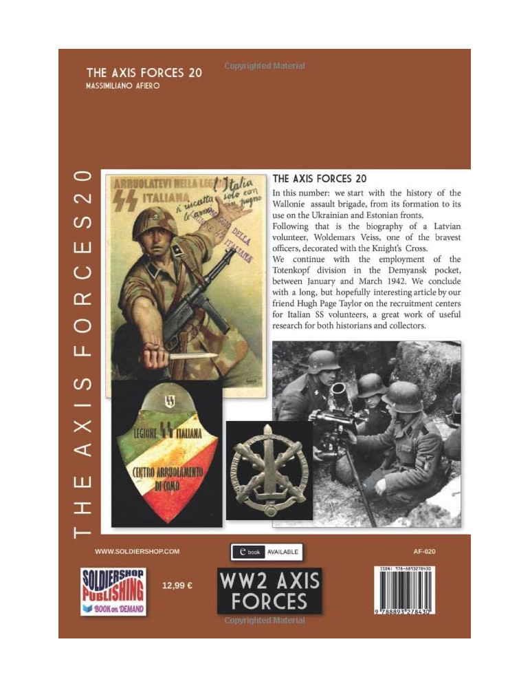 The Axis Forces 20 par Massimiliano Afiero est un numéro de la série spécialisée consacrée aux unités et opérations des forces de l’Axe durant la Seconde Guerre mondiale. Illustré de nombreuses photos d’époque et profils en couleur, il propose des articles détaillés, uniformes, insignes et récits opérationnels, idéal pour les passionnés d’histoire militaire et les collectionneurs de documentation spécialisée.