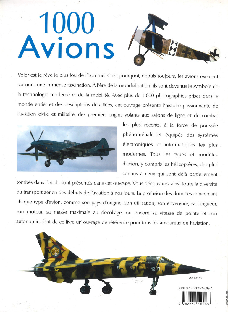 Voler est le rêve le plus fou de l'homme. C'est pourquoi, depuis toujours, les avions exercent sur nous une immense fascination. À l'ère de la mondialisation, ils sont devenus le symbole de la technologie moderne et de la mobilité. Avec plus de 1000 photographies prises dans le monde entier et des descriptions détaillées, cet ouvrage présente l'histoire passionnante de l'aviation civile et militaire, des premiers engins volants aux avions de ligne et de combat les plus récents, à la force de poussée phénoménale et équipés des systèmes électroniques et informatiques les plus modernes. Tous les types et modèles d'avion, y compris les hélicoptères, des plus connus à ceux qui sont déjà partiellement tombés dans l'oubli, sont présentés dans cet ouvrage. Vous découvrirez ainsi toute la diversité du transport aérien des débuts de l'aviation à nos jours. La profusion des données concernant chaque type d'avion, comme son pays d'origine, son utilisation, son envergure, sa longueur, son moteur, sa masse maximale au décollage, ou encore sa vitesse de pointe et son autonomie, font de ce livre un ouvrage de référence pour tous les amoureux de l'aviation.