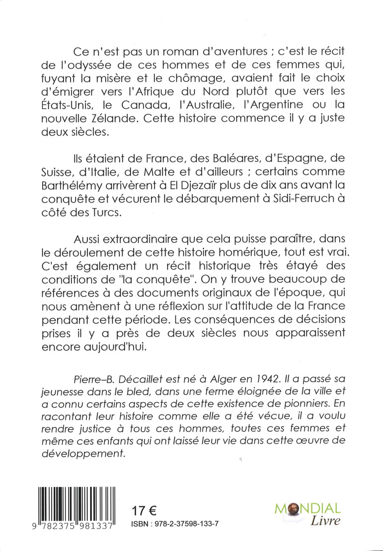 Ce n'est pas un roman d'aventures; c'est le récit de l'odyssée de ces hommes et de ces femmes qui, fuyant la misère et le chômage, avaient fait le choix. d'émigrer vers l'Afrique du Nord plutôt que vers les États-Unis, le Canada, l'Australie, l'Argentine ou la nouvelle Zélande. Cette histoire commence il y a juste deux siècles.