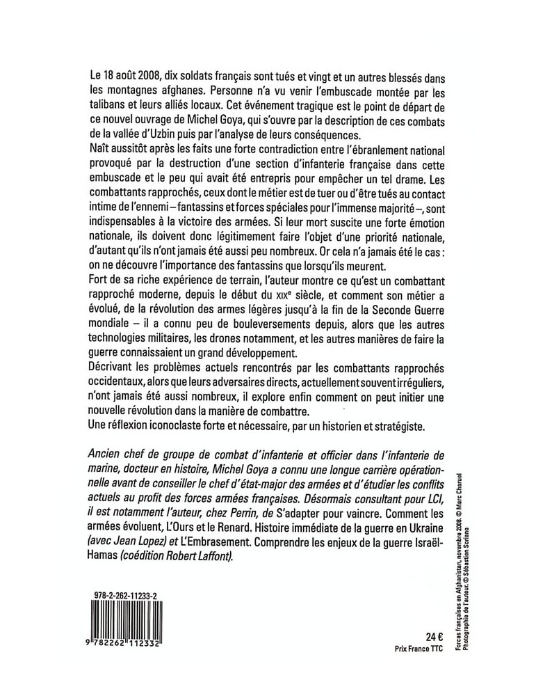 Le 18 août 2008, dix soldats français sont tués et vingt et un autres blessés dans les montagnes afghanes. Personne n'a vu venir l'embuscade montée par les talibans et leurs alliés locaux. Cet événement tragique est le point de départ de ce nouvel ouvrage de Michel Goya, qui s'ouvre par la description de ces combats de la vallée d'Uzbin puis par l'analyse de leurs conséquences.