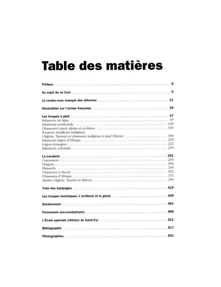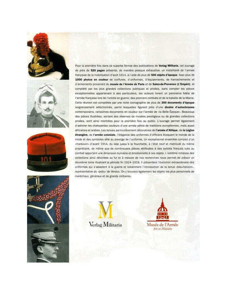 Avec plus de 300 photographies en noir et blanc soigneusement sélectionnées et dix photographies couleur originales et contemporaines («autochromes»), le lecteur a une impression réaliste de l'apparence de l'armée française à la «Belle Epoque». Le livre montre au lecteur le panache de l'armée française au début de la guerre en Europe, complétée par les traditions des unités africaines et arabes et les influences sur les uniformes. Les vêtements d'inspiration orientale de «L'Armée d'Afrique», les uniformes de la Légion étrangère et des troupes coloniales et les vêtements élégants des officiers reflètent à la fois les modes de l'époque et le prestige du port de l'uniforme.