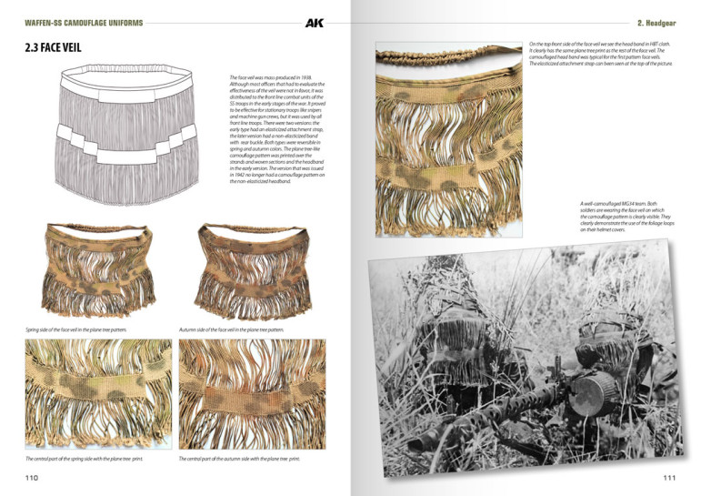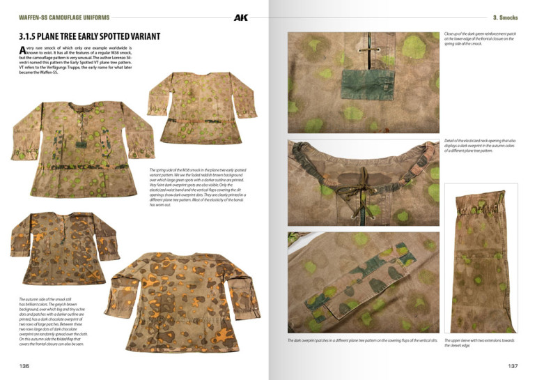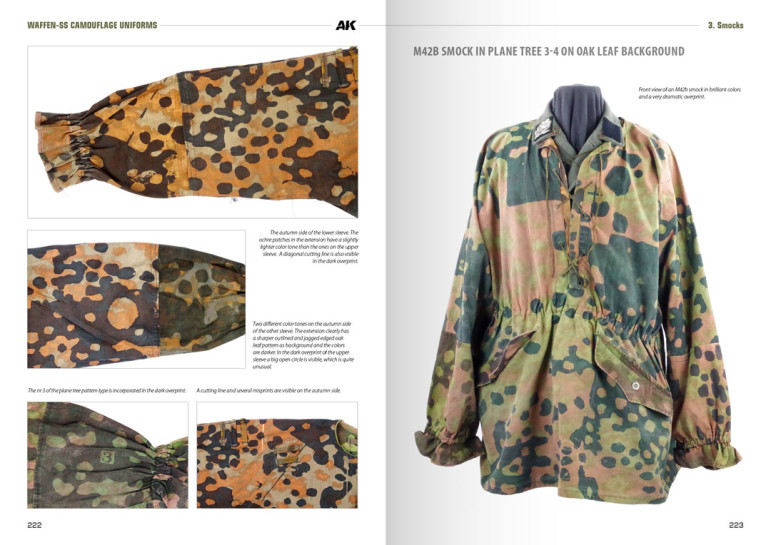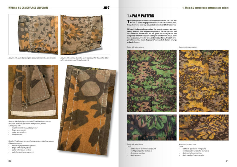 Des photographies en couleur montrent en détail tous les principaux motifs de camouflage SS sur leurs faces automne et printemps. Toutes les couleurs utilisées sont décrites en détail.
