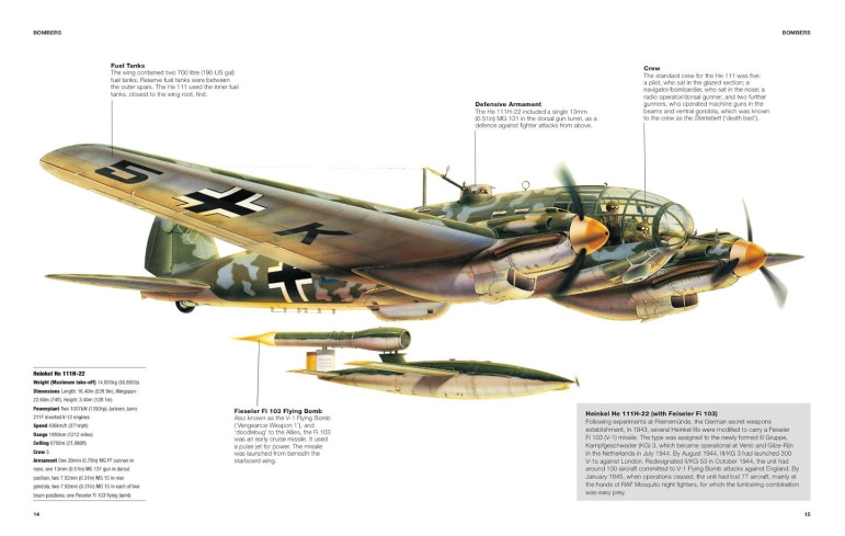 Le livre aborde les modèles emblématiques tels que le Heinkel He 111, le Junkers Ju 88, le Dornier Do 17, le Junkers Ju 87 Stuka ou encore les bombardiers lourds développés durant la guerre. Chaque appareil est présenté à travers des profils en couleur détaillés, des photographies et des données techniques permettant de comprendre leur conception, leurs performances et leur rôle opérationnel.