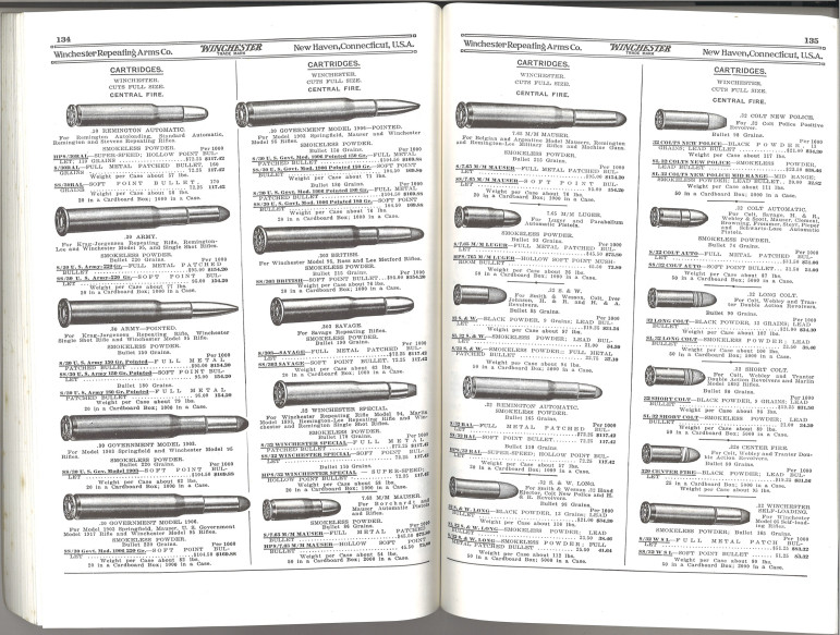 Les pages intérieures montrent notamment les caractéristiques des cartouches : type de projectile, poids en grains, poudre utilisée (smokeless ou black powder), compatibilités avec différents modèles d’armes, ainsi que les conditionnements.