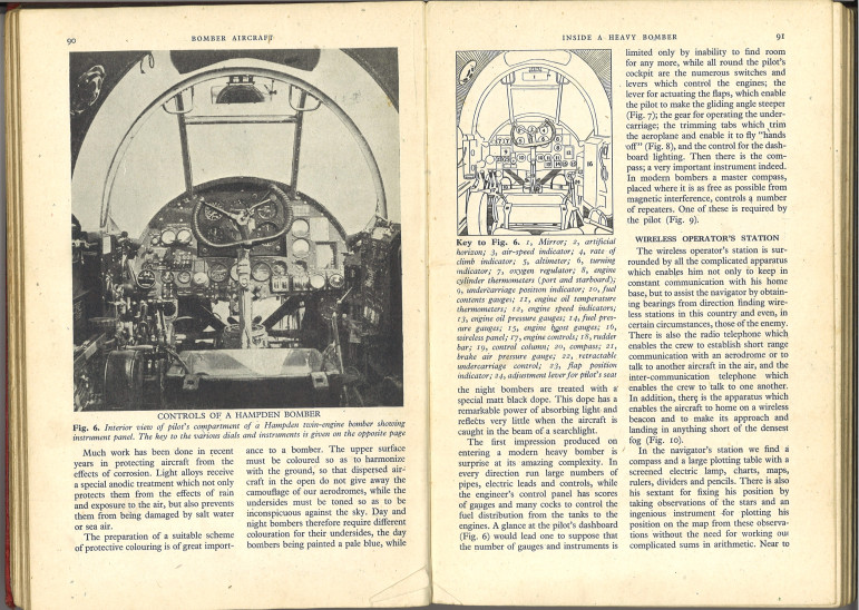 Le livre propose une immersion dans l’univers de la R.A.F., en détaillant les différents types d’appareils — notamment les bombardiers, comme le Handley Page Hampden — ainsi que leur équipement, leur cockpit et leur instrumentation. Les pages illustrées présentent avec précision les postes de pilotage, les systèmes de contrôle et les fonctions des instruments de bord.