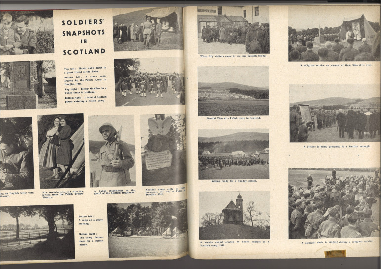 Les pages présentées montrent notamment la présence de troupes polonaises en Écosse, leur vie quotidienne, leurs cérémonies et leur intégration dans le contexte britannique. L’ouvrage constitue ainsi un témoignage rare sur la diaspora militaire polonaise et la propagande alliée de l’époque.