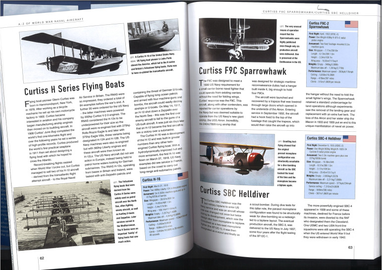 Suit un répertoire alphabétique de 130 des avions navals les plus importants au monde. La description et l'historique de chaque appareil sont accompagnés d'une fiche technique détaillant le pays d'origine, la date du premier vol, la puissance, l'armement, les dimensions, le poids et les performances.