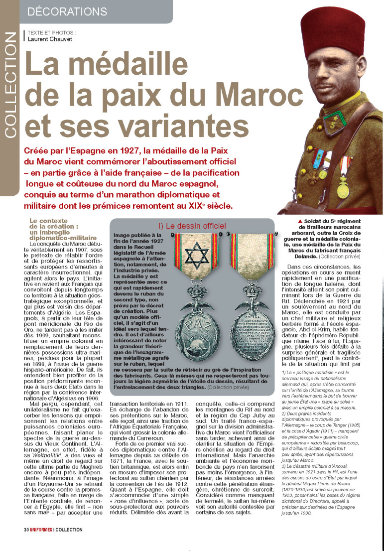 Créée par l’Espagne en 1927, la médaille de la Paix du Maroc vient commémorer l’aboutissement officiel – en partie grâce à l’aide française – de la pacifi cation longue et coûteuse du nord du Maroc espagnol, conquis au terme d’un marathon diplomatique et militaire dont les prémices remontent au XIXe siècle.