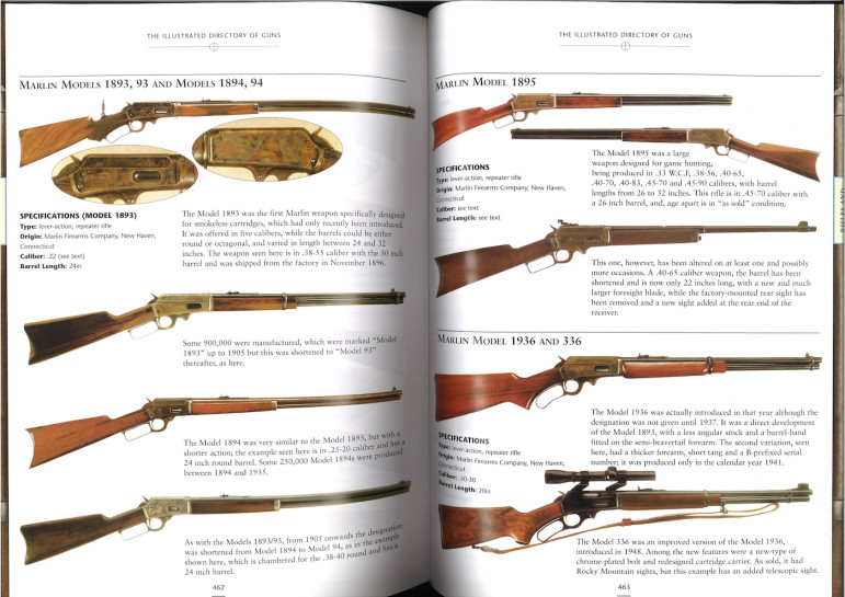 Les pages présentées illustrent notamment des armes longues américaines (Marlin), démontrant la richesse iconographique de l’ouvrage, bien au-delà des seules armes de poing.