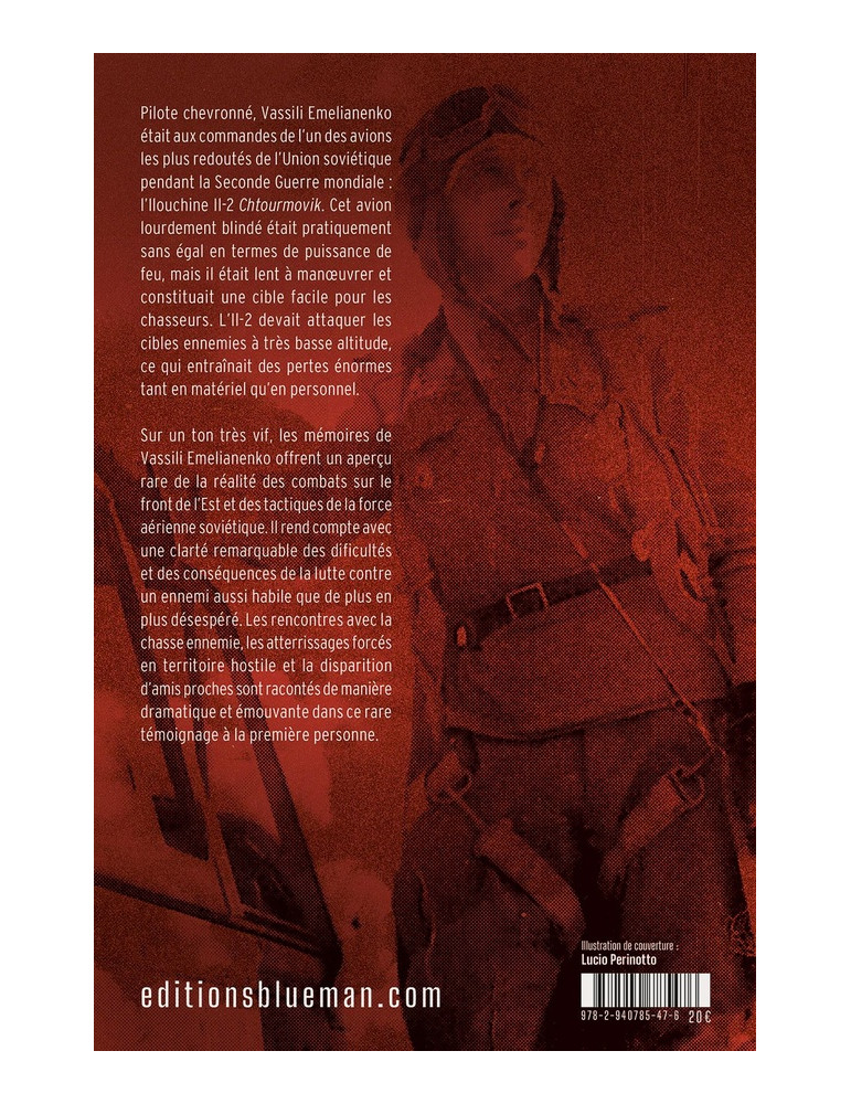 Pilote chevronné, Vassili Emelianenko était aux commandes de l'un des avions les plus redoutés de l'Union soviétique pendant la Seconde Guerre mondiale : l’Iliouchine Il-2 Chtourmovik. Cet avion lourdement blindé était pratiquement sans égal en termes de puissance de feu, mais il était lent à manoeuvrer et constituait une cible facile pour les chasseurs. L’Il-2 devait attaquer les cibles ennemies à très basse altitude, ce qui entraînait des pertes énormes tant en matériel qu'en personnel. Il n'est donc pas étonnant qu'après 80 missions de combat contre les Allemands, Vassili Emelianenko ait reçu la plus haute distinction : le titre de Héros de l'Union soviétique. Il effectuera un total de 92 missions. Son avion a été abattu à trois reprises, et à chaque fois, il a réussi à rentrer à la base, faisant preuve d'une résilience et d'un courage remarquables face à des circonstances terrifiantes. Sur un ton très vif, les mémoires de Vassili Emelianenko offrent un aperçu rare de la réalité des combats sur le front de l’Est et des tactiques de la force aérienne soviétique. Il rend compte avec une clarté remarquable des difficultés et des conséquences de la lutte contre un ennemi aussi habile que de plus en plus désespéré. Les rencontres avec la chasse ennemie, les atterrissages forcés en territoire hostile et la disparition d’amis proches sont racontés de manière dramatique et émouvante dans ce rare témoignage à la première personne.