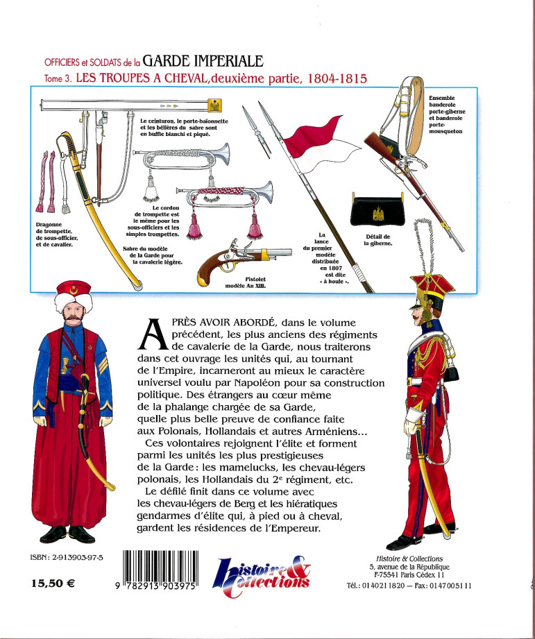 Le troisième tome de cette série à succès consacrée à la phalange d'élite de l'Empereur, complète l'étude de la cavalerie de la Garde. On trouve dans ce Tome 3 les Mamelucks avec leur tenue orientale, les célèbres lanciers polonais, les lanciers rouges (hollandais), les lanciers de Berg, la gendarmerie d'élite. Un quatrième volume traitera de la suite des troupes montées de la Garde impériale : gendarmerie d'élite, gendarmes d'ordonnance, les éclaireurs...
