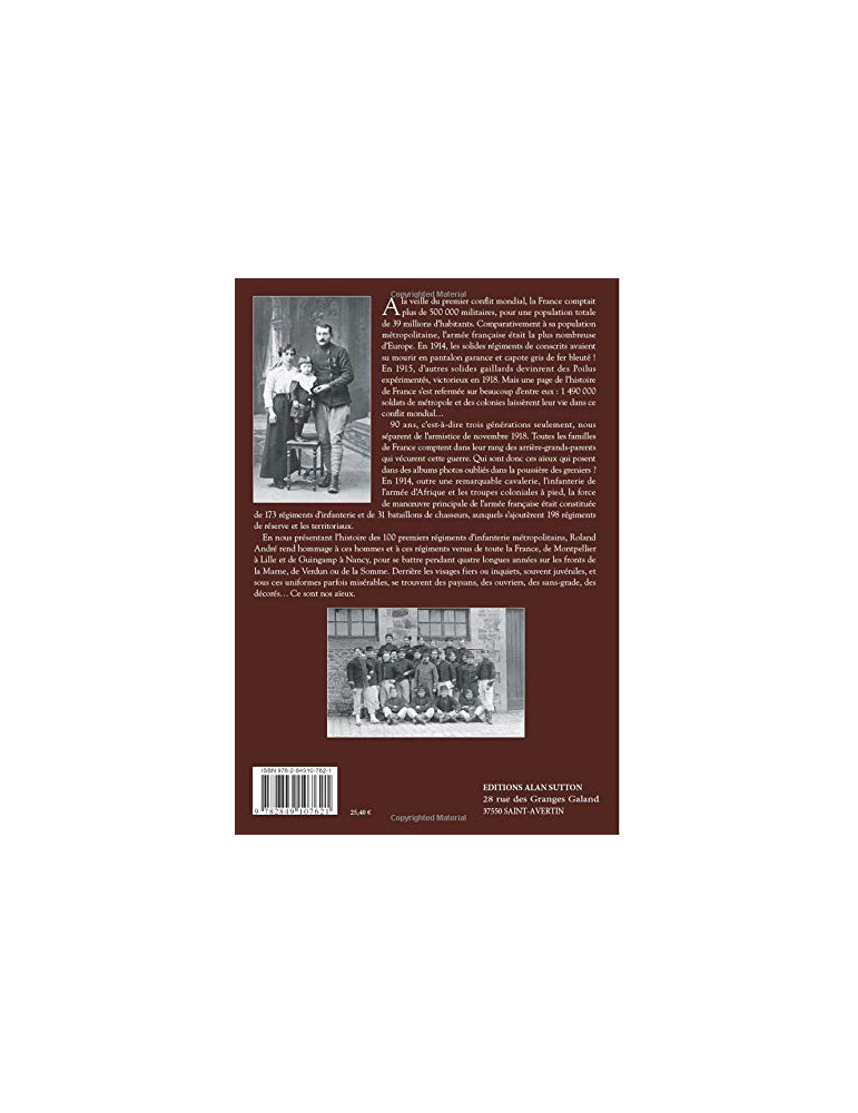 En nous présentant l'histoire des 100 premiers régiments d'infanterie métropolitains, Roland André rend hommage à ces hommes et à ces régiments venus de toute la France, de Montpellier à Lille et de Guingamp à Nancy, pour se battre pendant quatre longues années sur les fronts de la Marne, de Verdun ou de la Somme. Derrière les visages fiers ou inquiets, souvent juvéniles, et sous ces uniformes parfois misérables, se trouvent des paysans, des ouvriers, des sans-grade, des décorés. Ce sont nos aïeux.
