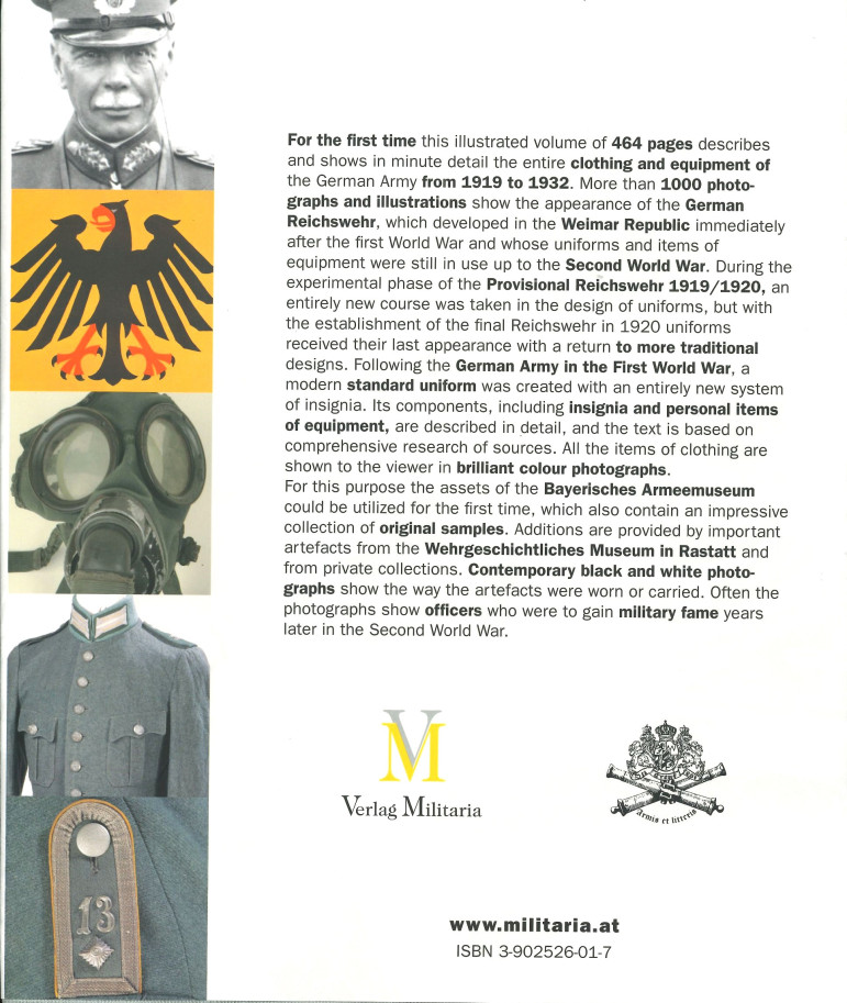 Au cours de la phase expérimentale de la Reichswehr provisoire 1919/1920, un tout nouveau cours a été suivi dans la conception des uniformes, mais avec la création de la Reichswehr finale en 1920, les uniformes ont reçu leur dernière apparition avec un retour à des conceptions plus traditionnelles. Après l'armée allemande pendant la Première Guerre mondiale, un uniforme standard moderne a été créé avec un tout nouveau système d'insignes. Ses composants, y compris les insignes et les équipements personnels, sont décrits en détail, et le texte est basé sur une recherche approfondie des sources.